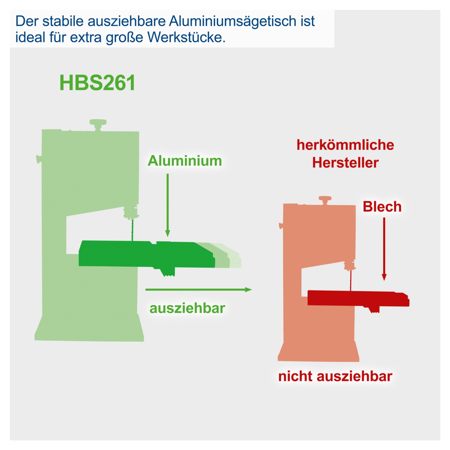 • großer Sägetisch mit 307 x 315 mm – ausziehbar bis 520 mm – für sicheres Arbeiten auch mit großen Werkstücken