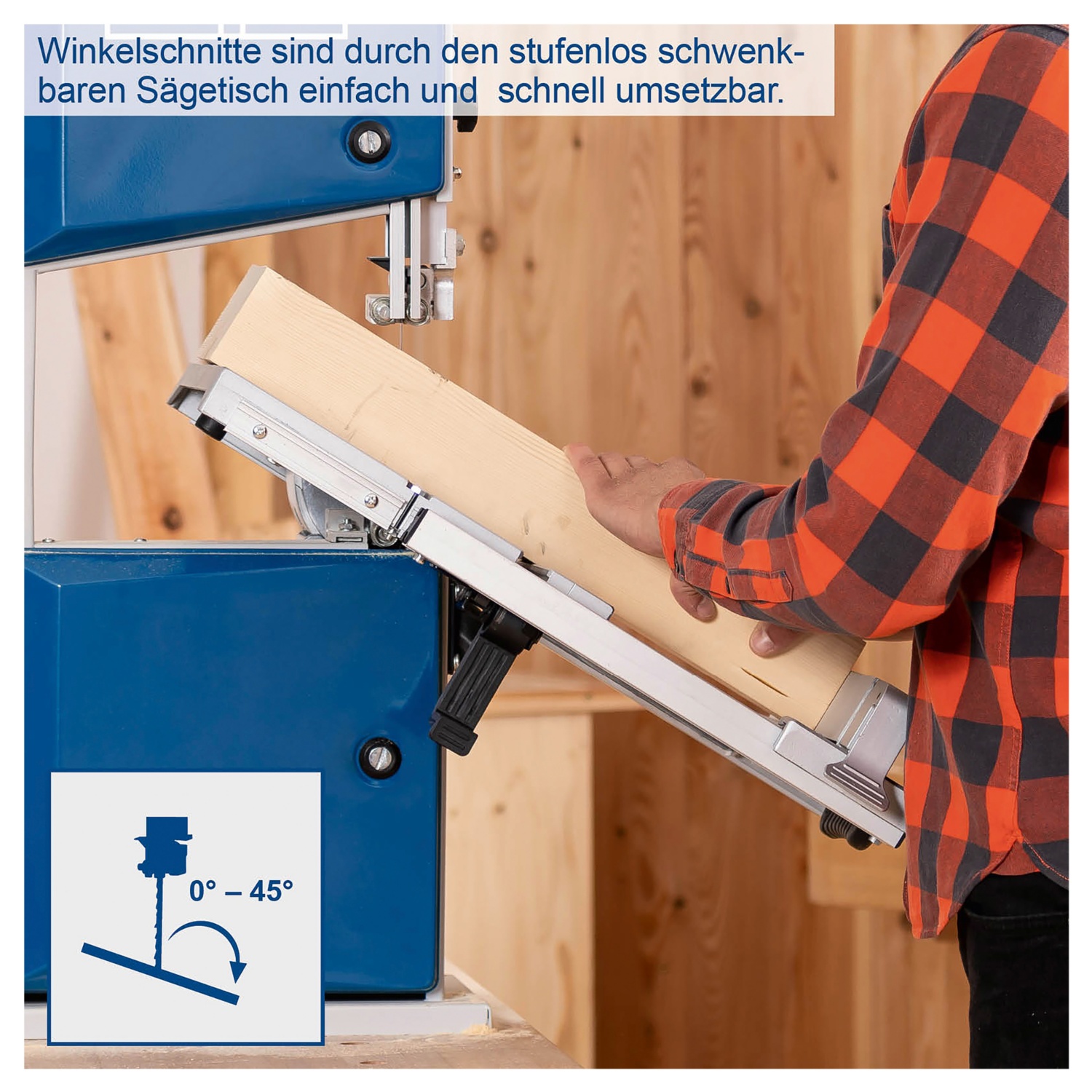 • stufenlos neigbarer Sägetisch bis 45° – ideal fürGehrungsschnitte