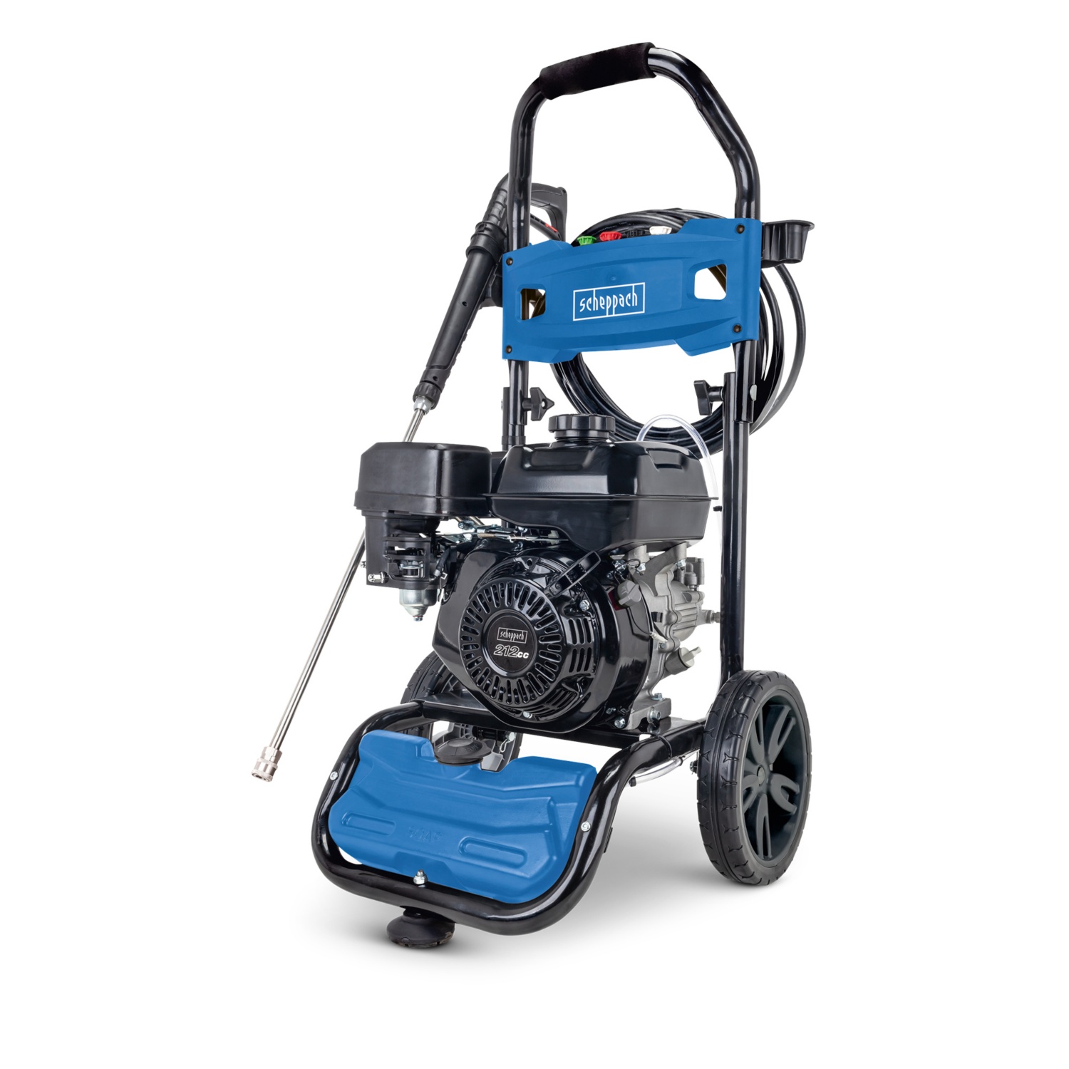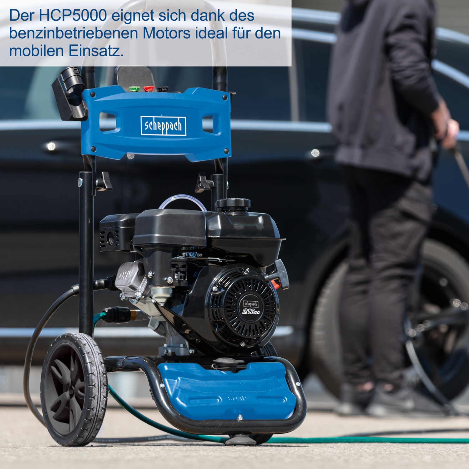 Der Scheppach Benzin-Hochdruckreiniger HCP5000 ist der ideale Helfer für zu Hause, auf dem Hof oder auf der Baustelle, zum Entfernen hartnäckiger Verschmutzungen auf Wegen, Flächen, Terrassen, Fahrzeugen, Booten und Terrassenmöbeln. Der kraftvolle 5,9 PS / 4,3 kW 4-Takt-Benzinmotor und ein Maximaldruck von 241 bar sorgen für optimale Arbeitsergebnisse. Große Laufräder und ein Transportgriff ermöglichen einen einfachen Transport an den Einsatzort. Die stabile, verwindungssteife und pulverbeschichtete Stahlkonstruktion sowie der Standfuß sorgen für einen kippsicheren Stand während des Arbeitens. Geliefert wird der Hochdruckreiniger mit 4 verschiedenen Düsenaufsätzen (3 x Hochdruck-Düse: 0° / 25° / 40°/ 1 x Niederdruck- bzw. Reinigungsdüse), einer Reinigungslanze und einer Düsenreinigungsnadel.