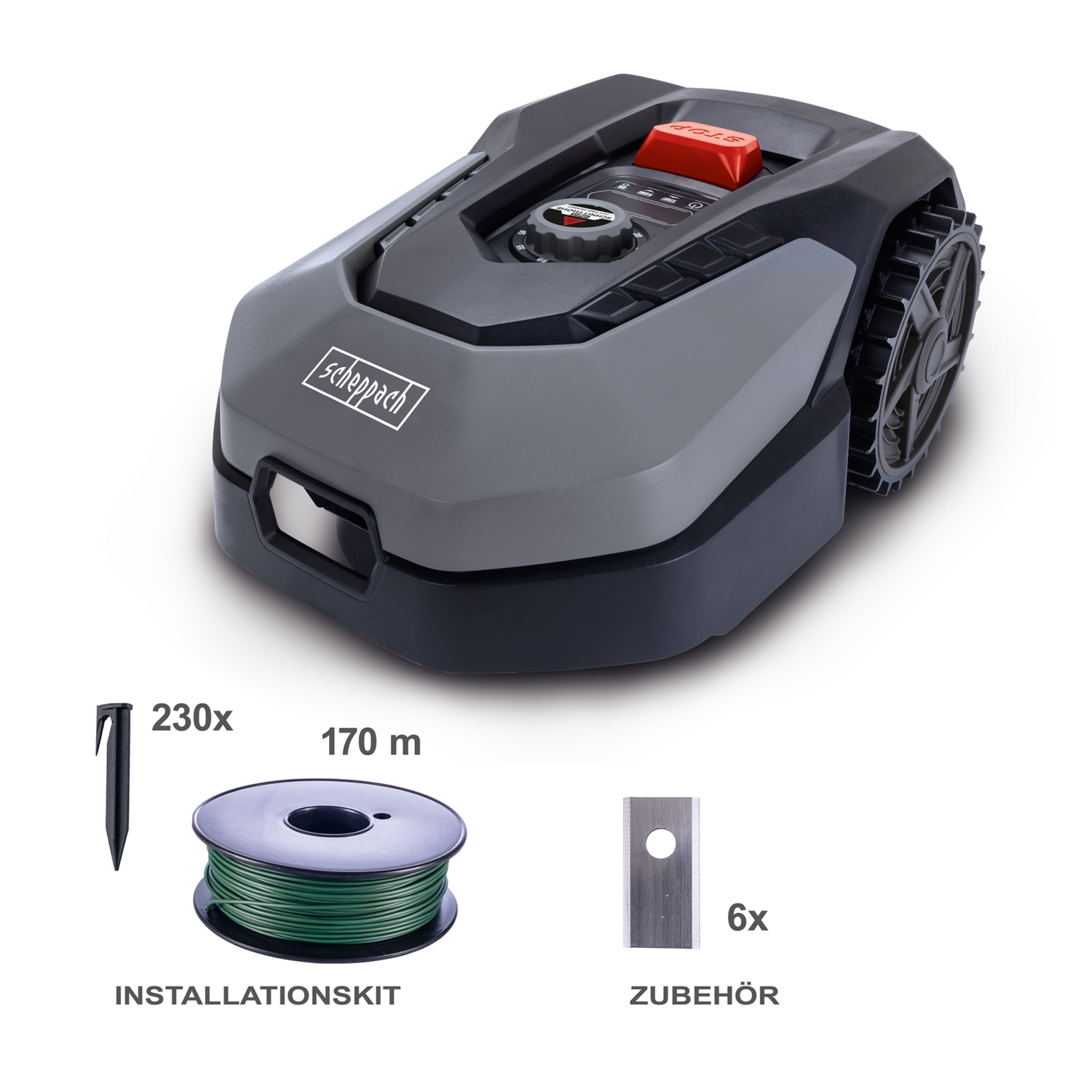 • inkl. 3 A-Ladestation, 170 m Begrenzungskabel, 230 Bodenanker, 9 Mähmesser (3 vormontiert, 6 Ersatzmesser)und Garage