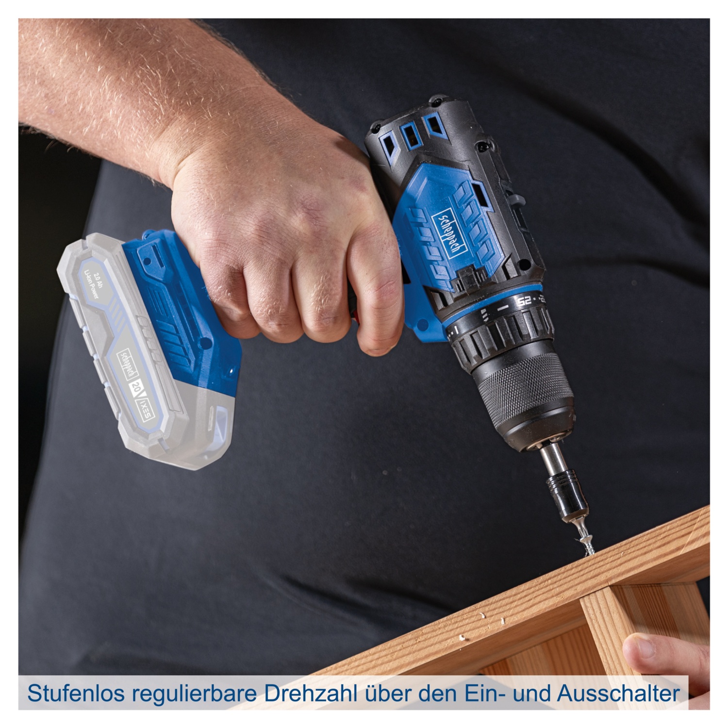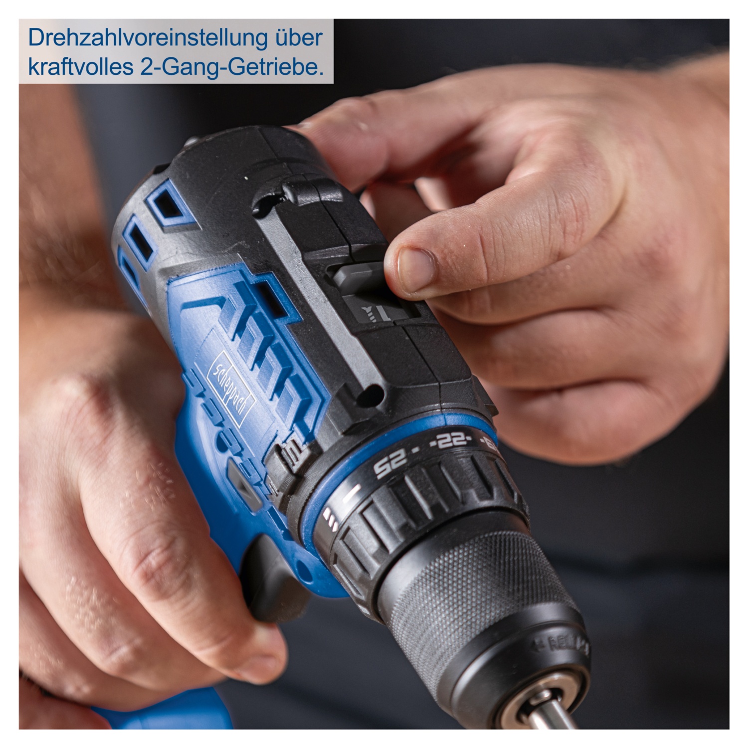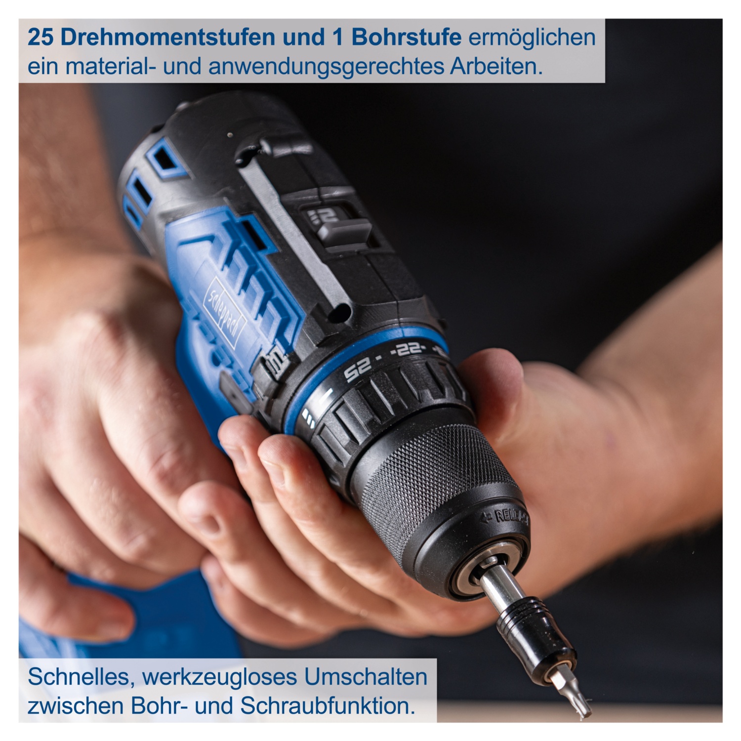 • schnelles, werkzeugloses Umschalten zwischen Bohr- und Schraubfunktion