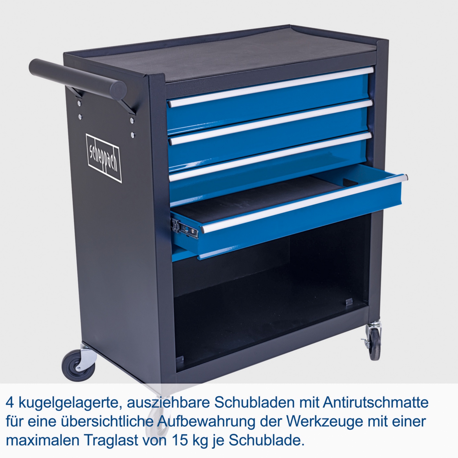 • 4 kugelgelagerte, ausziehbare Schubladen mit Antirutschmatte für eine übersichtliche Aufbewahrung der Werkzeuge mit einer maximalen Traglast von 15 kg je Schublade
