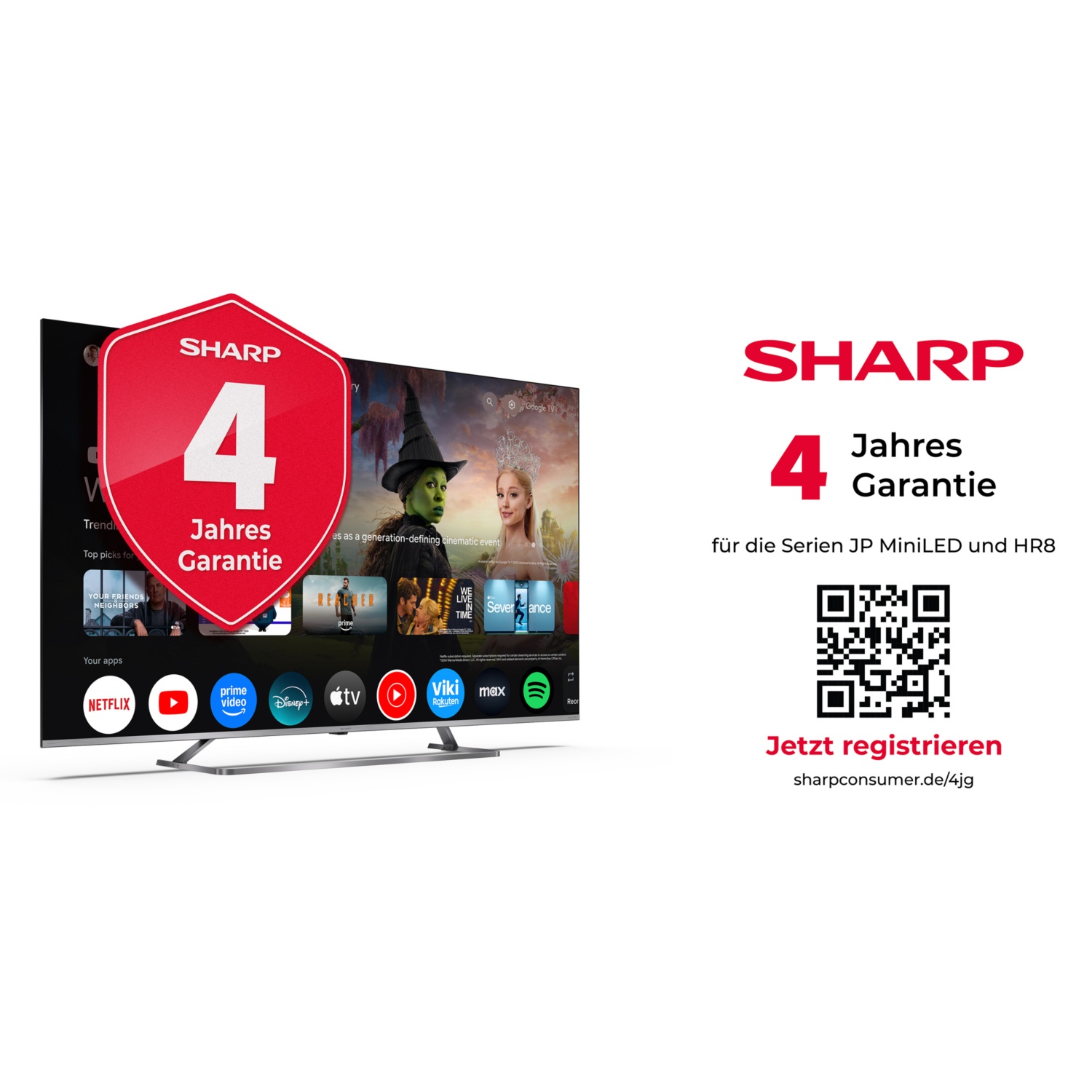 Die 4-Jahres-Garantie gilt für Sharp Fernseher der JP MiniLED-Serie die zwischen 01.01.2026 und 30.09.2026 gekauft wurden.