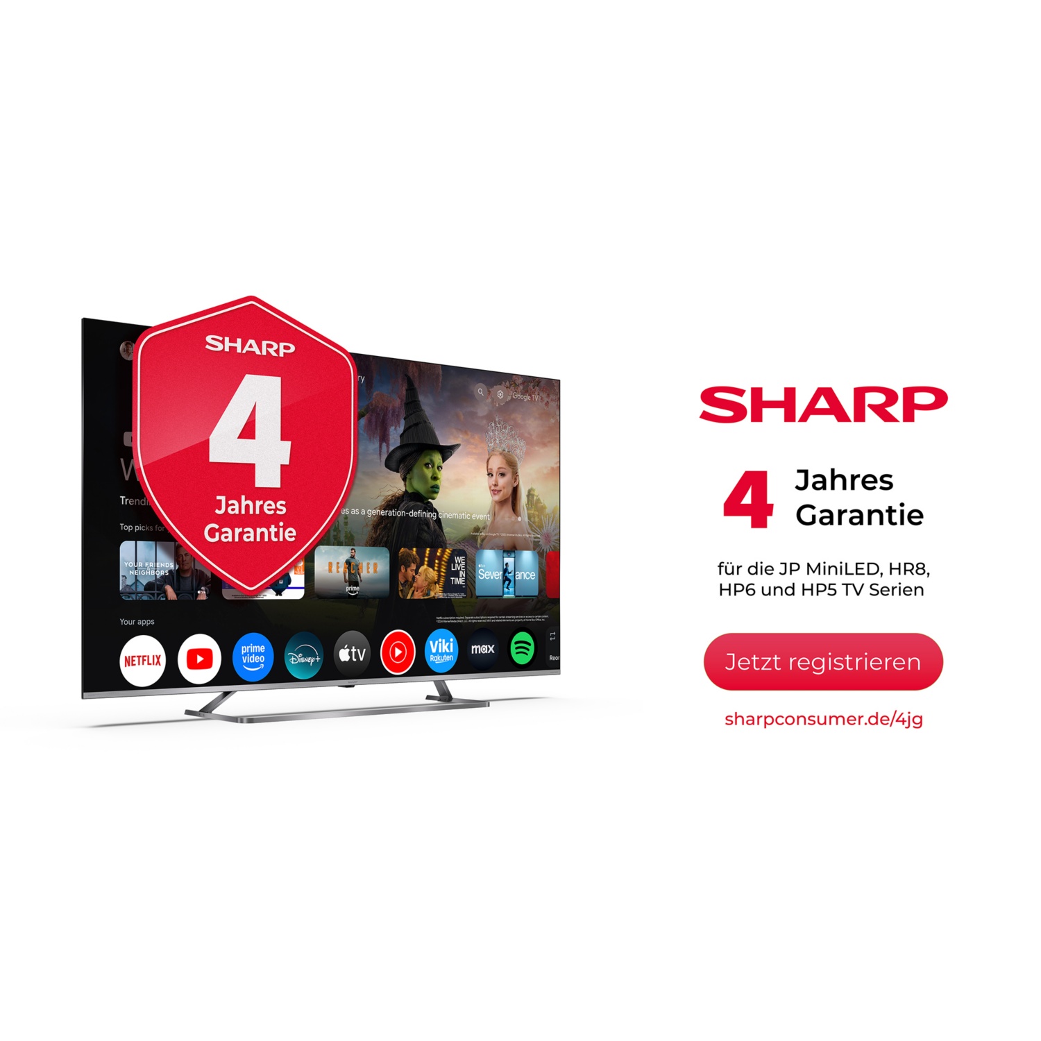 Die 4-Jahres-Garantie gilt für alle Sharp Fernseher der HP5-Serie, die zwischen 01.04.2026 und 30.09.2026 gekauft wurden.