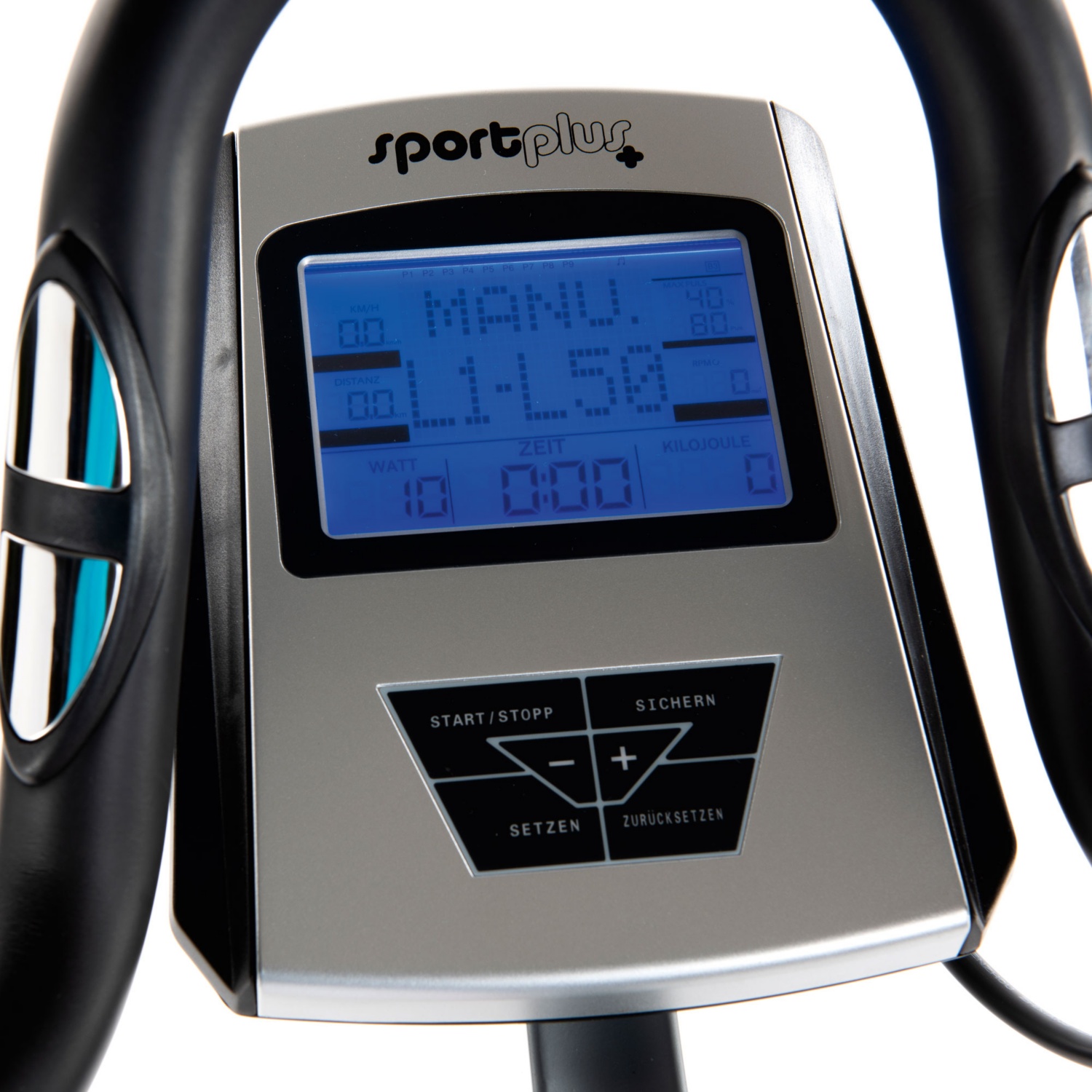 • Trainingscomputer mit LCD-Anzeige zeigt: Trainingszeit, -strecke, Geschwindigkeit, Leistung in Watt, Trittfrequenz, Puls, ca. Energieverbrauch