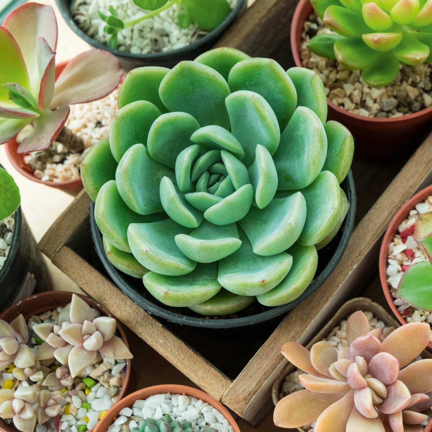 im 8-cm-Keramikübertopf in 3 verschiedenen Modellen, diverse besonders pflegeleichte Sorten wie Echeverie, Haworthie oder Dickblatt