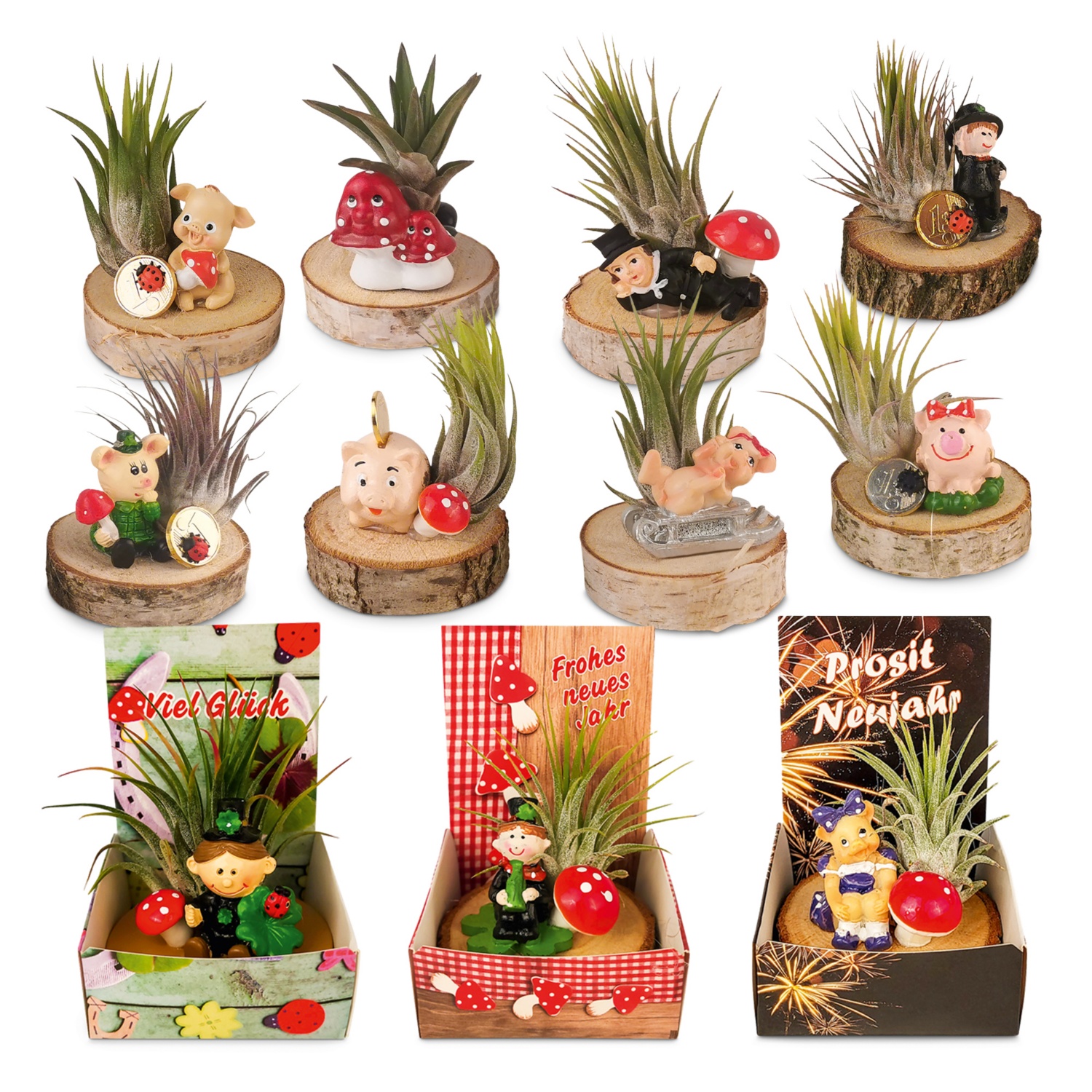 kleines Arrangement bestehend aus Glücksbringer Symbol/Figur und Tillandsie, Tillandsien sind äußerst robust und pflegeleicht, da sie sich ausschließlich von Wassertau und Luftfeuchtigkeit ernähren, 1 x wöchentlich sollten sie mit Wasser besprüht werden