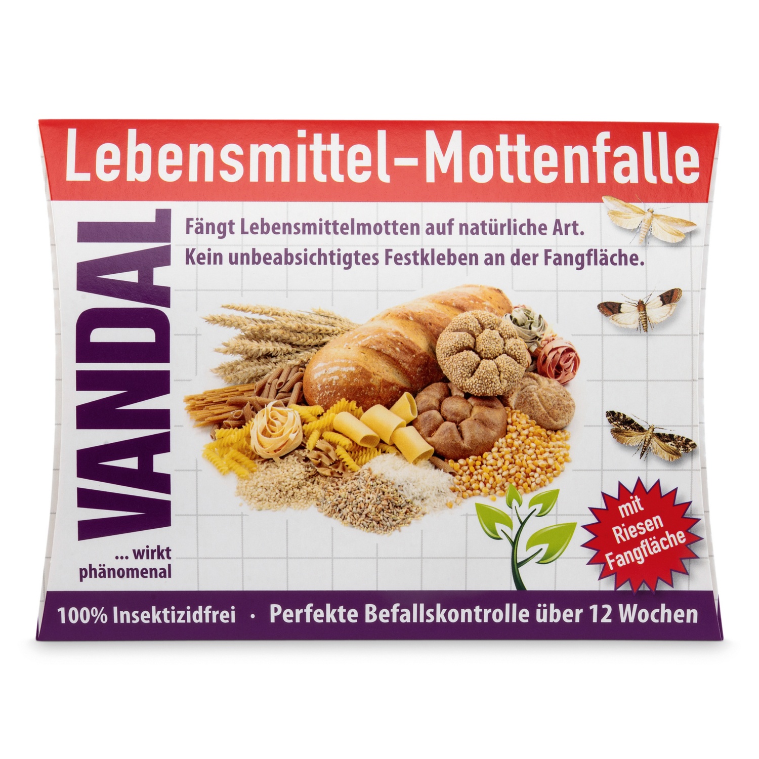 Die VANDAL Lebensmittel-Mottenfalle ist eine umweltgerechte, monatelang wirksame Klebefalle. Sie ermöglicht mit der über 350 cm² großen Fangfläche eine bequeme Befallskontrolle. Die VANDAL Lebensmittel- Mottenfalle ist unbedenklich in der Küche und in allen Wohnräumen anwendbar. Eine Falle ist ausreichend für einen Raum bis 30 cm².