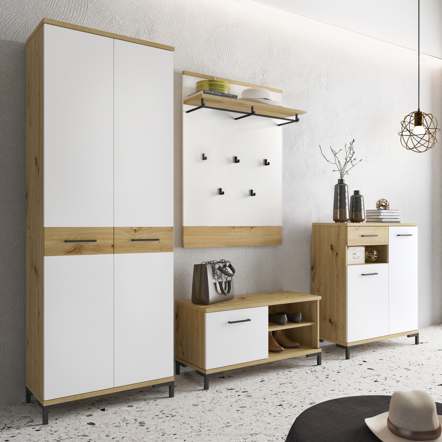aus Melamin weiß mit Wildeiche kombiniert, moderne Griffe und Füße matt schwarz, bestehend aus: