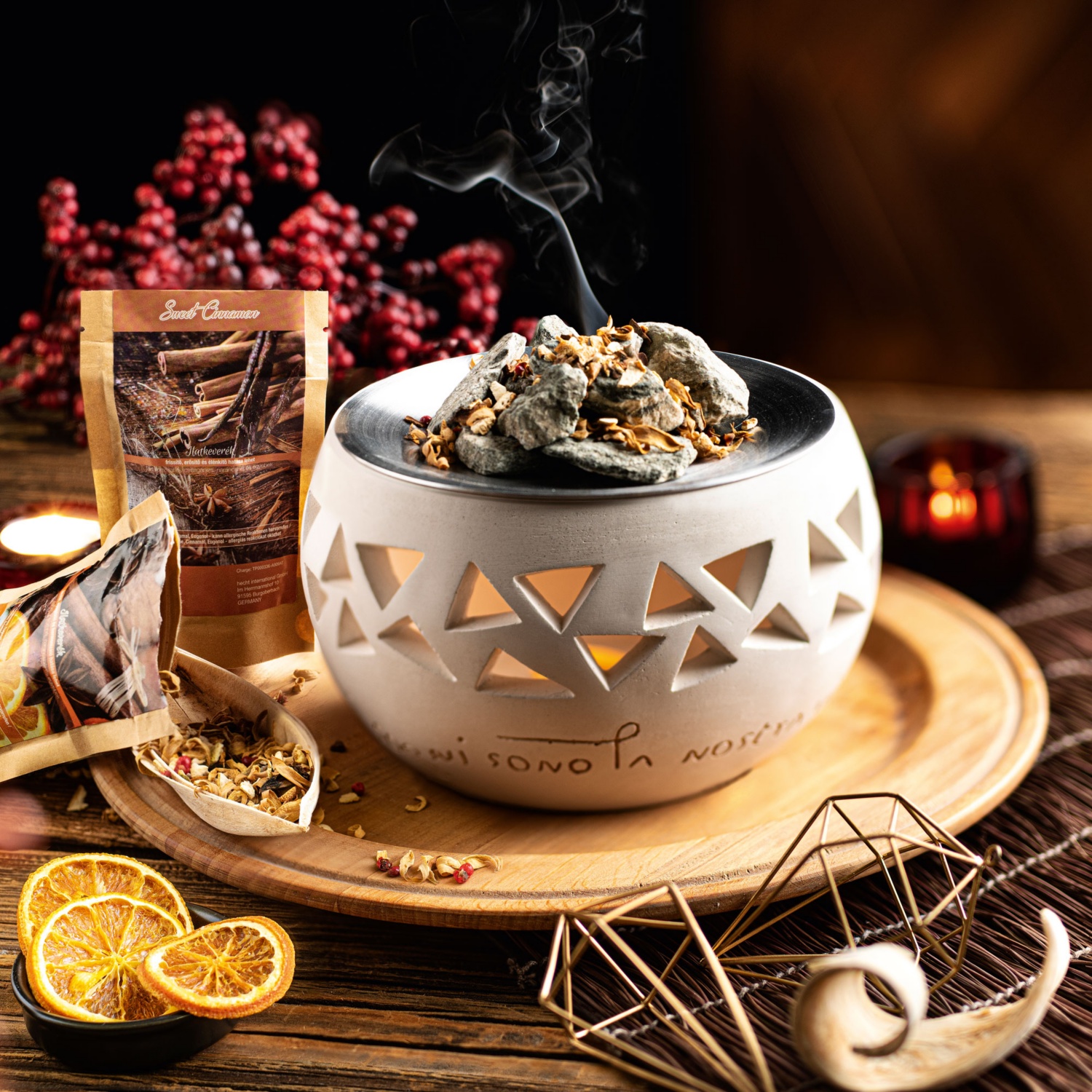 das entspannende Dufterlebnis für Ihr Zuhause, exklusives Design, handgearbeitet, auch für herkömmliche Duftöle geeignet, Brennkörper aus Gips (Ø 17 cm), Schüssel aus Aluminium, inkl. Saunasteine und 3 aromatische Duftmischungen, luftreinigende und energiesteigernde Wirkung