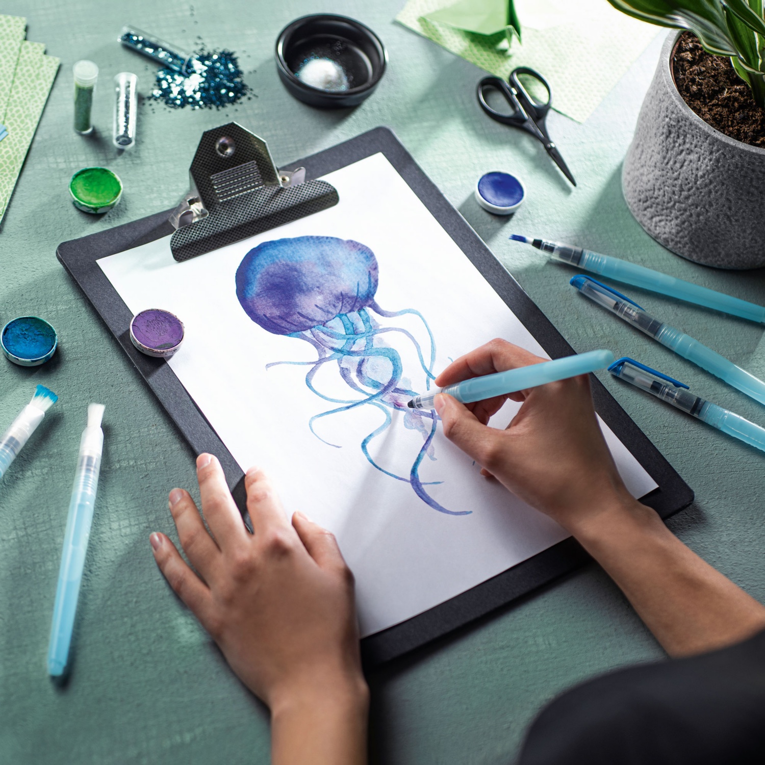 • Pinsel, Wassertank und Aquarellpinsel in einem