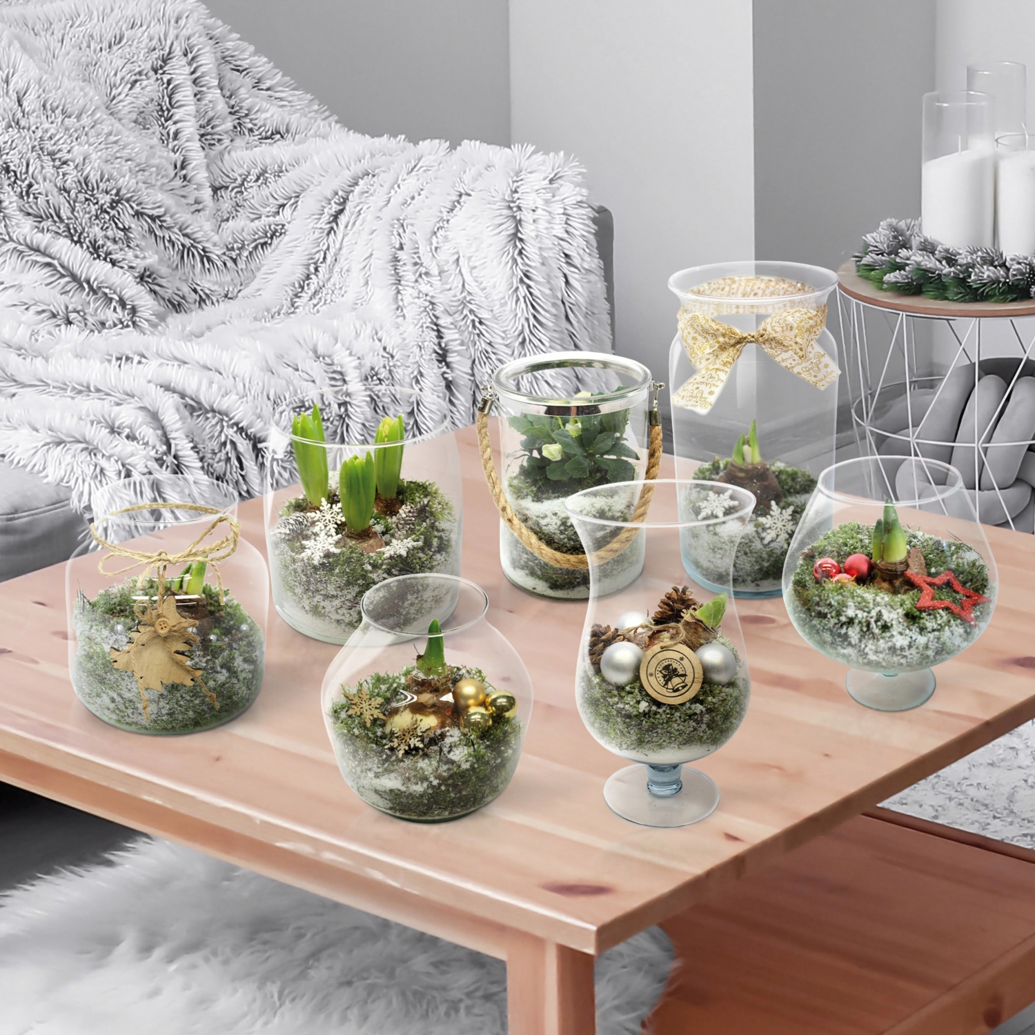 verschiedene weihnachtliche Gefäße, bepflanzt mit diversen Grün- und Blühpflanzen wieSukkulenten, Kalandiva, Hyazinthen etc.