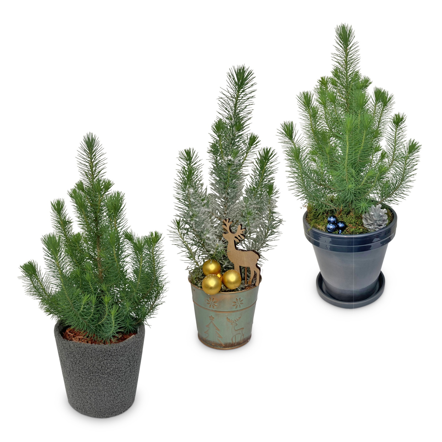 Höhe inkl. Gefäß ca. 60 cm (je nach Variante), zum Teil mit weihnachtlicher Dekoration, winterhart