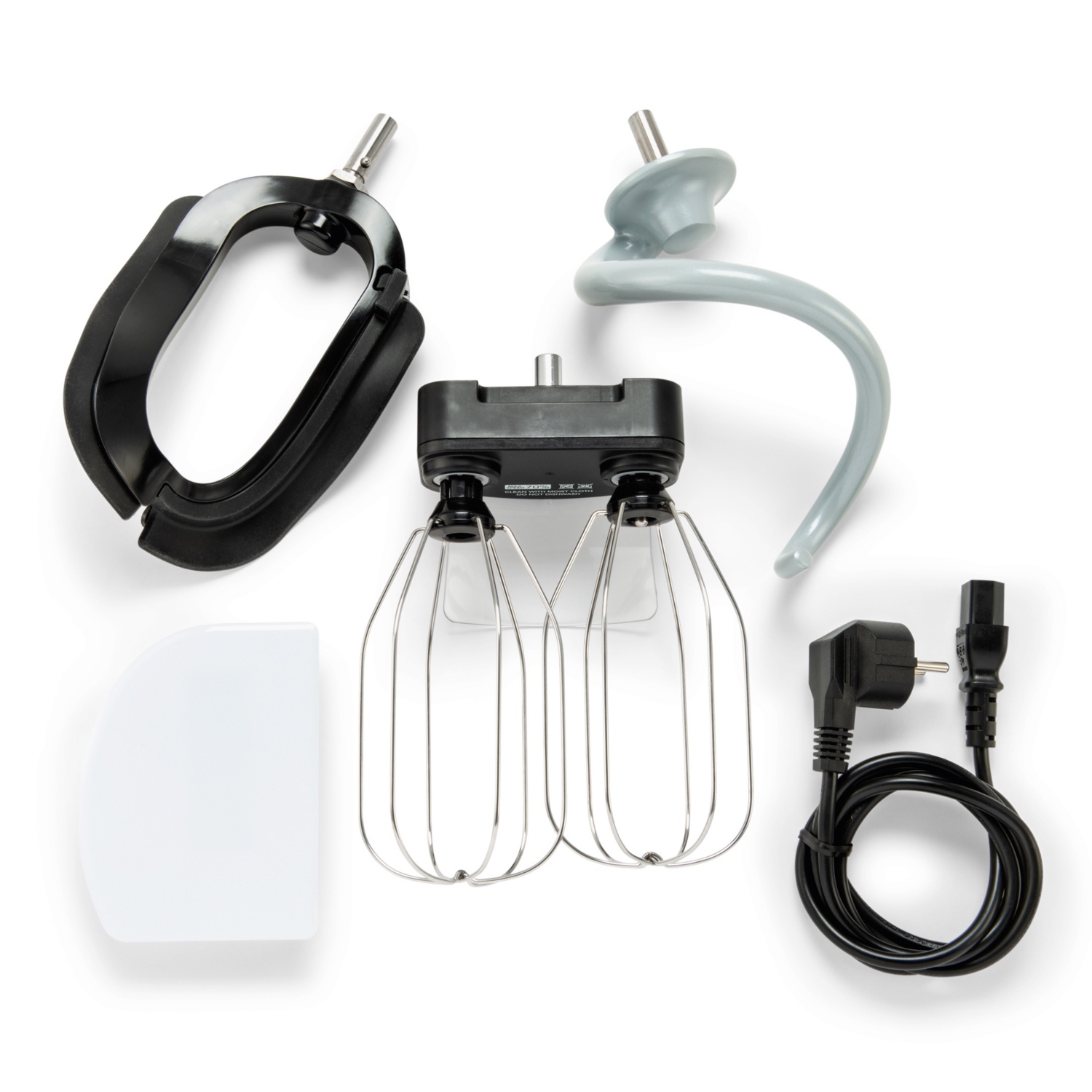 • inkl. Knethaken, Fachrührer, Doppelrührbesen und Spritzschutz