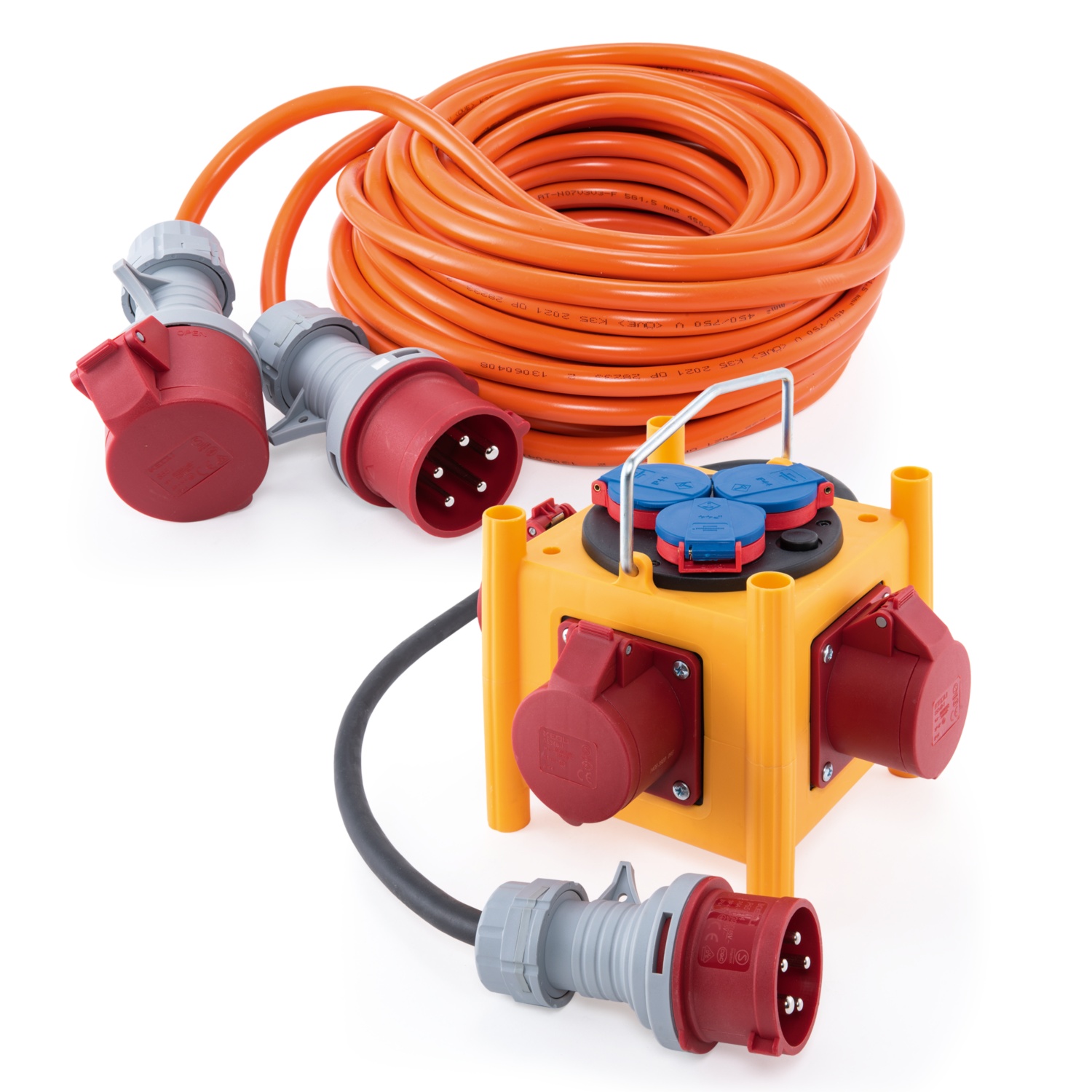 • CEE-Stromverteiler:H07RN-F 5G2,5, mit 1-m-Anschlussleitung, 3 Steckdosen CEE 5-polig 16 A/400 V und 3 Steckdosen 230 V