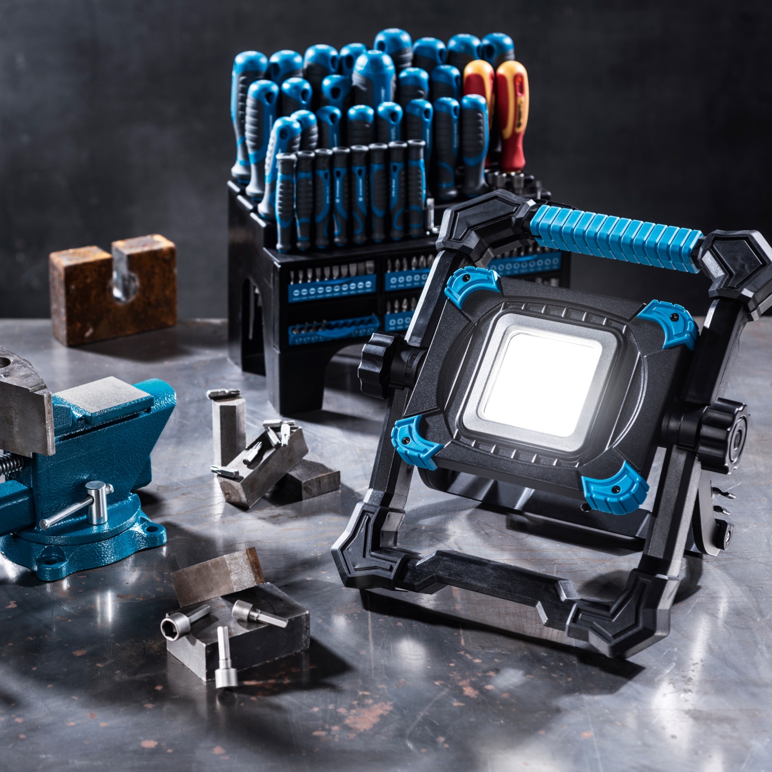 • mit Standgestell und ausklappbaren Montagehaken aus Aluminium