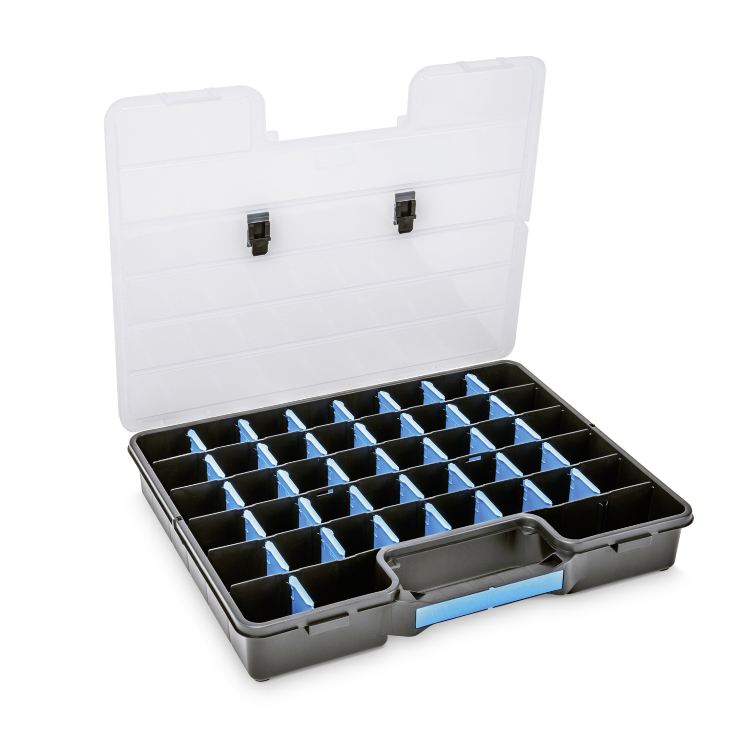 • schwarzes Unterteil mit transparentem Deckel, blaue verstellbare Trennwände, Schiebeverschlüsse und Griffabdeckung