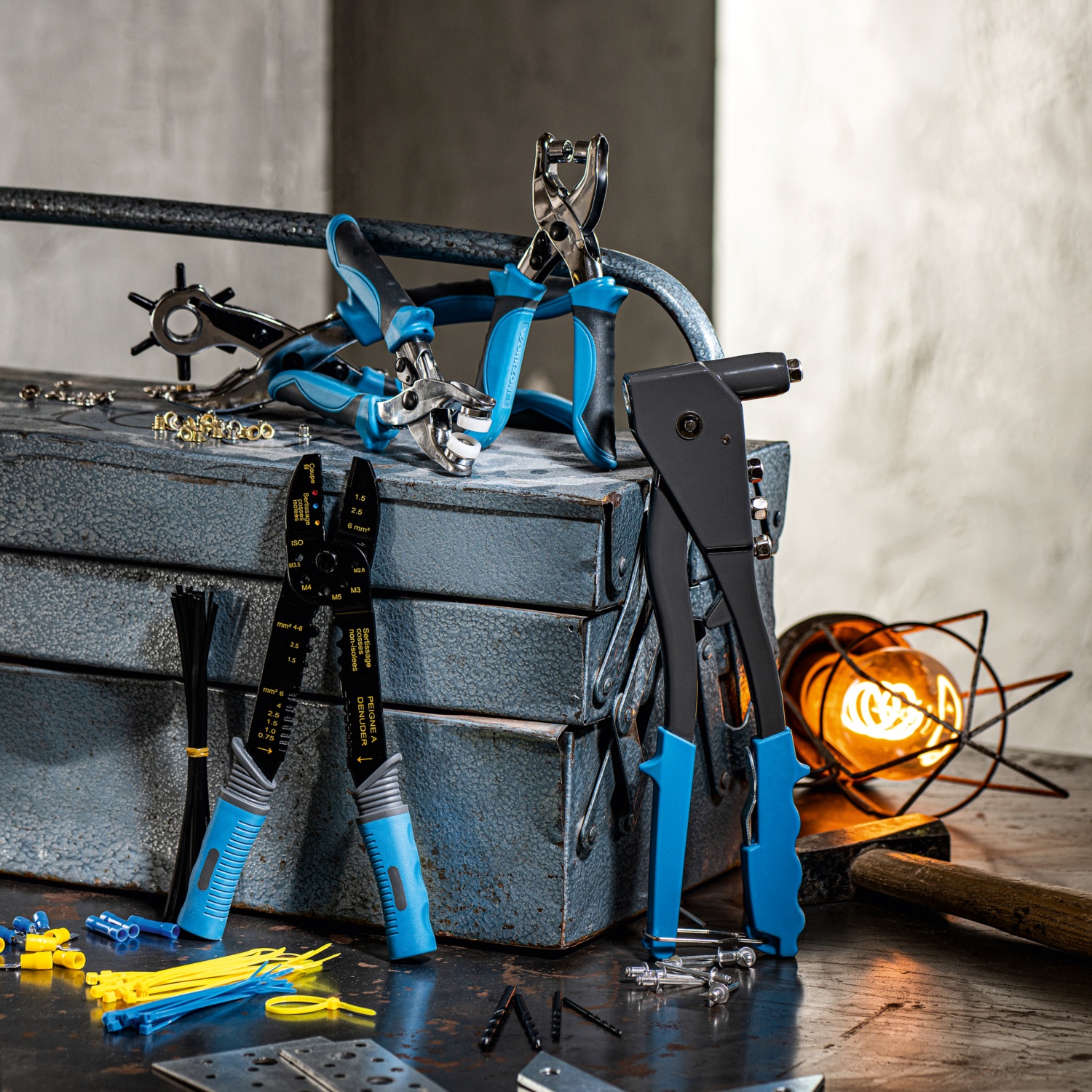 • inkl. 4 Nietkopfeinsätze, 60 Nieten, 4 HSS-Bohrer