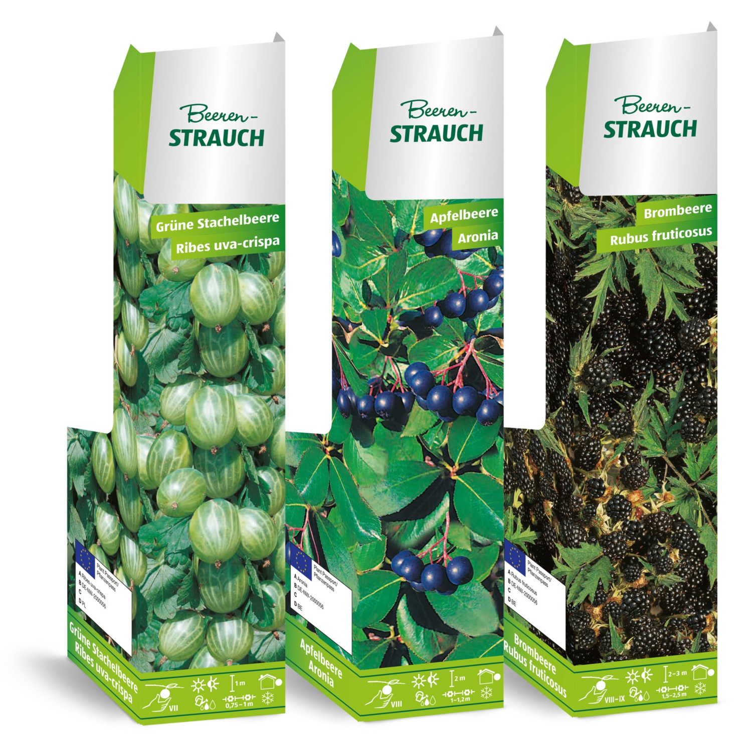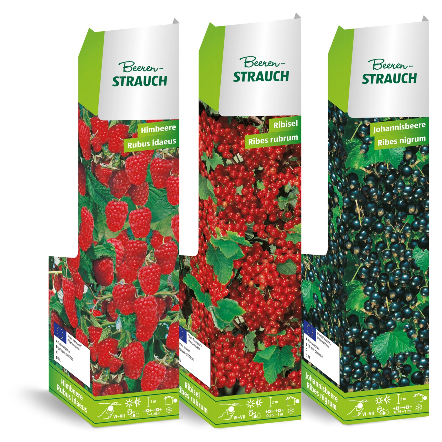 Höhe je nach Sorte mind. 35 cm, diverse Zier- und Beerensträucher wie Flieder, Hibiskus, Johannisbeere, Himbeere, Brombeere etc., wurzelballiert, winterhart
