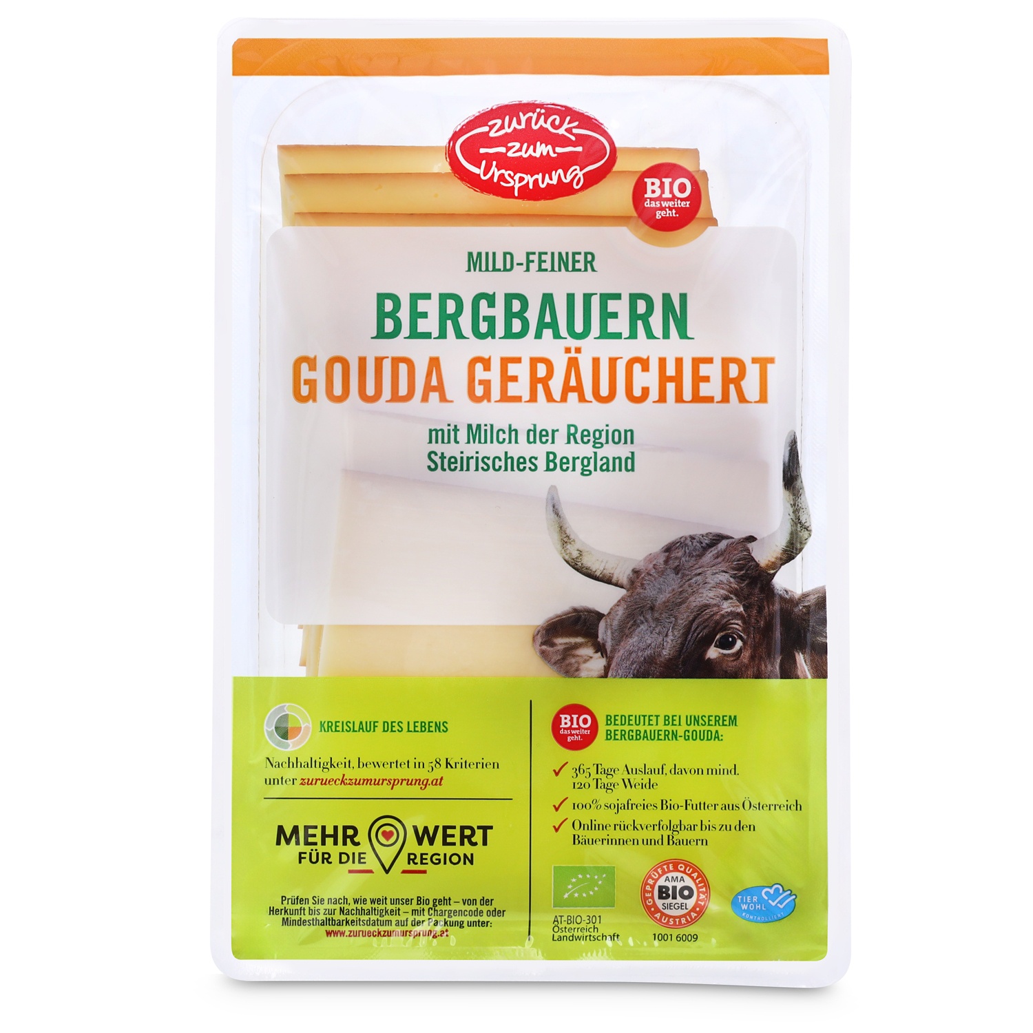 ZURÜCK ZUM URSPRUNG BIO-Bergbauern Käse in Scheiben, Gouda geräuchert