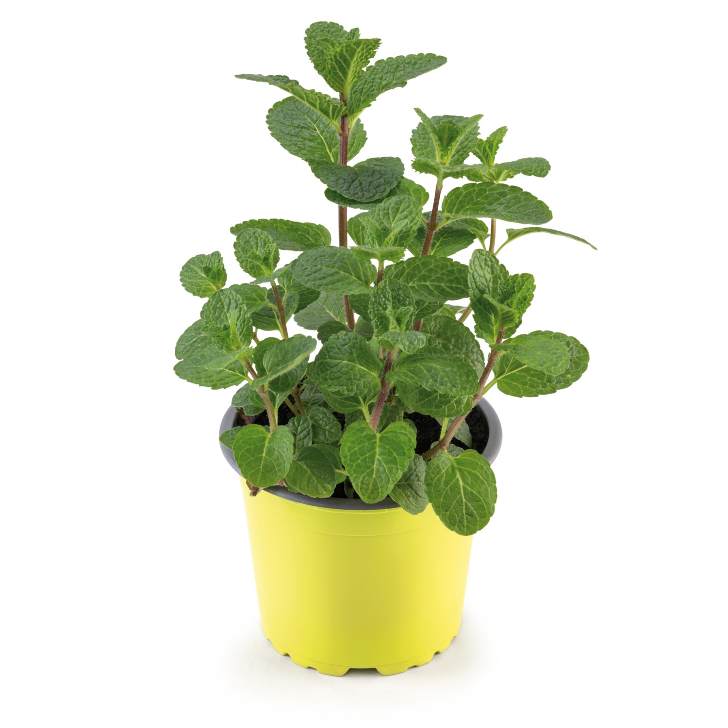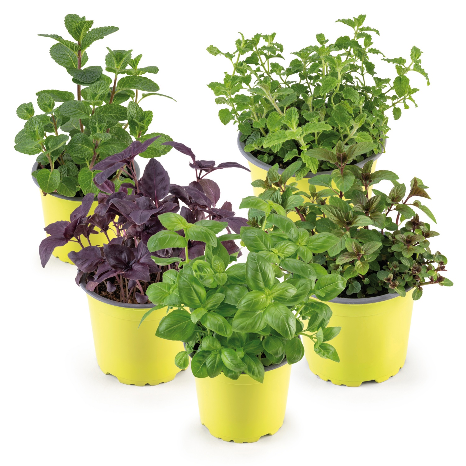im 12-cm-Topf, verschiedene Sorten wie Schokominze, Salbei tricolor, Zitronengras, rotes Basilikum etc.