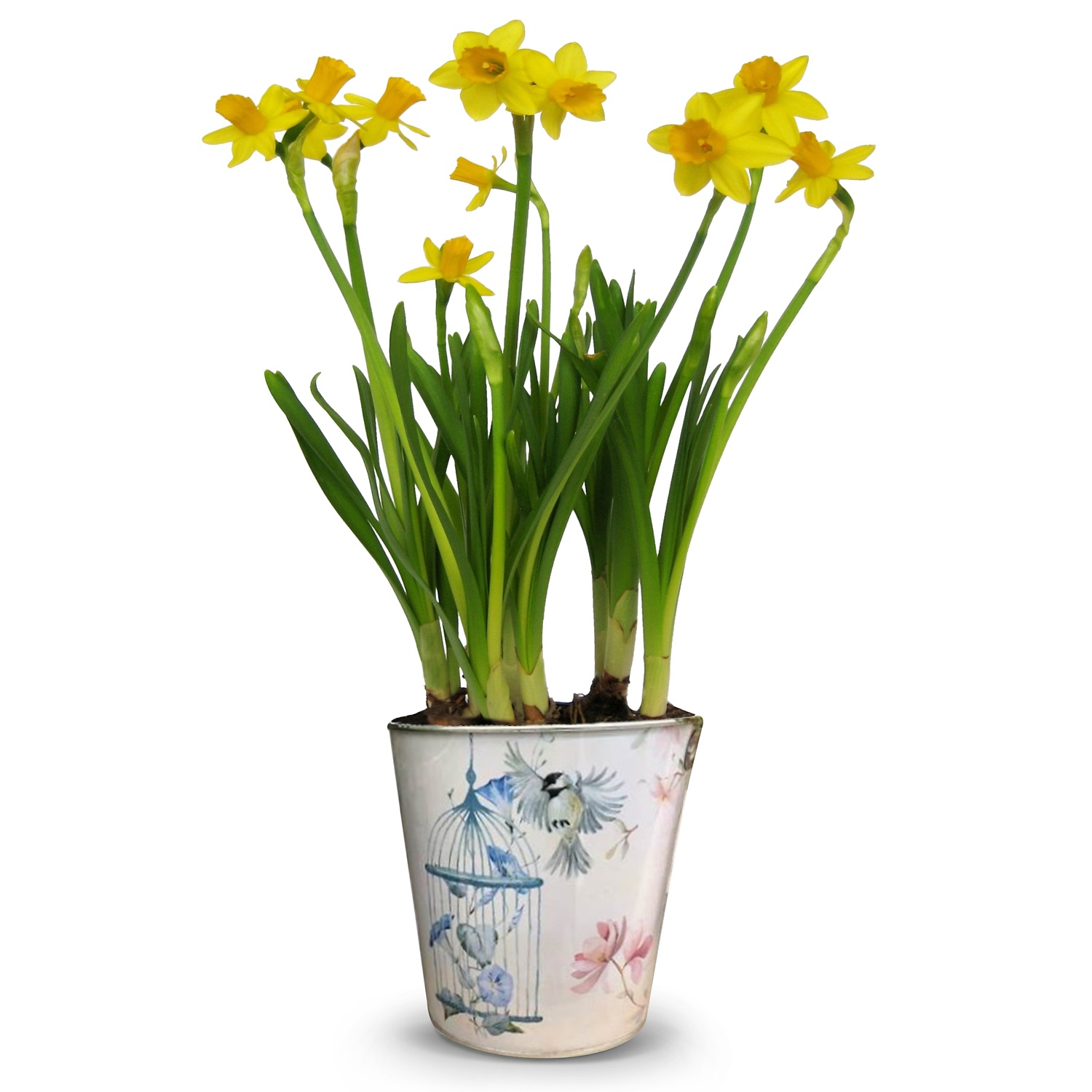 im ca. 13-cm-Übertopf aus Zink, Keramik oder in Betonoptik, mit Frühlingsblühern wie Hyazinthen und Narzissen bepflanzt