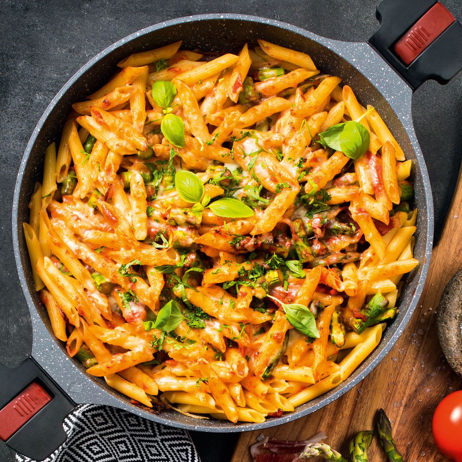 5. In einer Brat- und Backofenpfanne das Olivenöl erhitzen. Darin die Zwiebel goldbraun rösten. Kurz den Prosciutto mitbraten und mit dem Sugo ablöschen. Die Pasta und den Spargel beifügen und mit Salz und Pfeffer abschmecken.