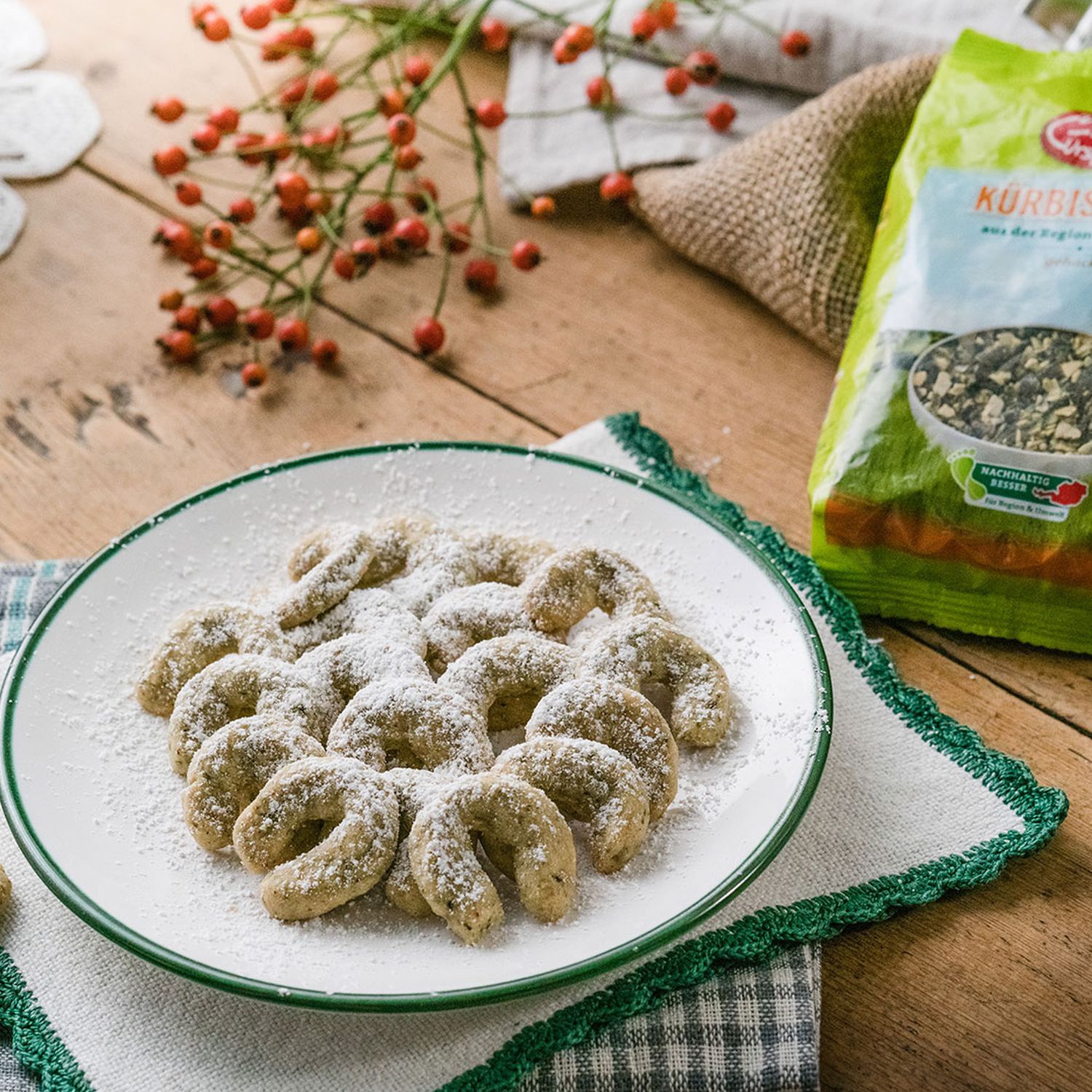 Mehl und Staubzucker in eine Schüssel sieben. Mit Vanillezucker, Kürbiskernen, Haselnüssen, Mandeln, Salz und Butter zu einem Teig verarbeiten.