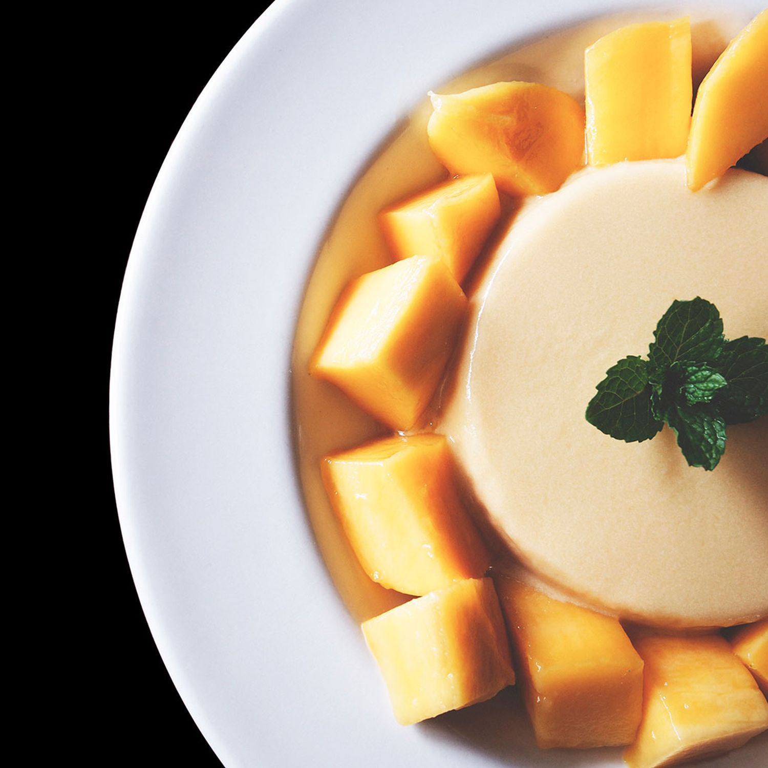 Die gut gekühlte Vanillecreme stürzen und mit den warmen, karamellisierten Bananen und Mangowürfeln servieren.