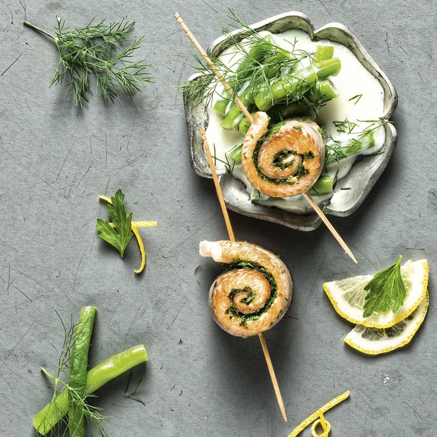 Petersilie waschen und fein hacken. Haut von den Lachsfilets entfernen, die Filets mit Zitronenabrieb, Salz und Pfeffer würzen und mit Petersilie bestreuen. Filets zusammenrollen und halbieren. Jede Rolle auf einen Holzspieß stecken. In einer Pfanne Olivenöl erhitzen und die Rollen vorsichtig auf jeder Seite ca. 4 Minuten braten.