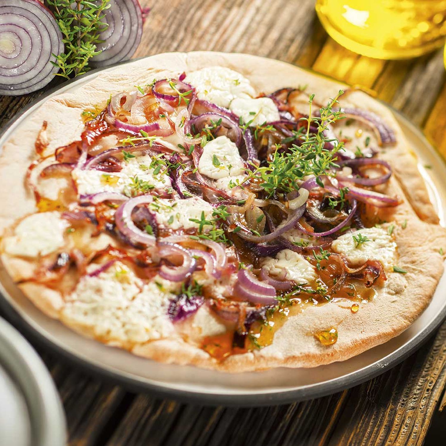 Pizza auf den Stein legen und knusprig backen. Mit Salz und Pfeffer würzen. Thymian-Honig nochmals kurz erwärmen und auf die Pizza träufeln. Mit etwas abgezupftem Thymian garnieren.