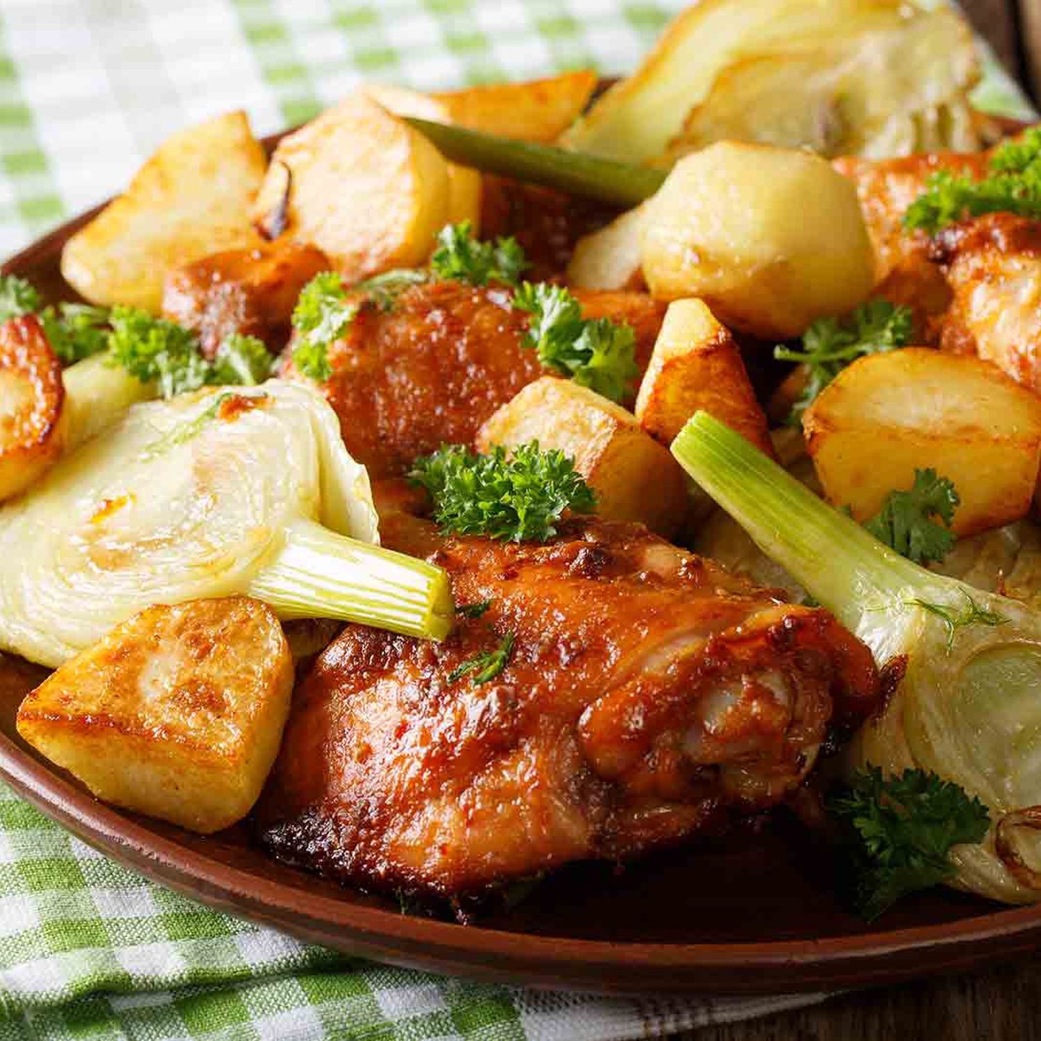 Die Kartoffeln mit den Chicken Wings auf ein Backblech legen. Etwa 35 Minuten im Ofen garen und mit einer würzigen Barbecue-Sauce anrichten.