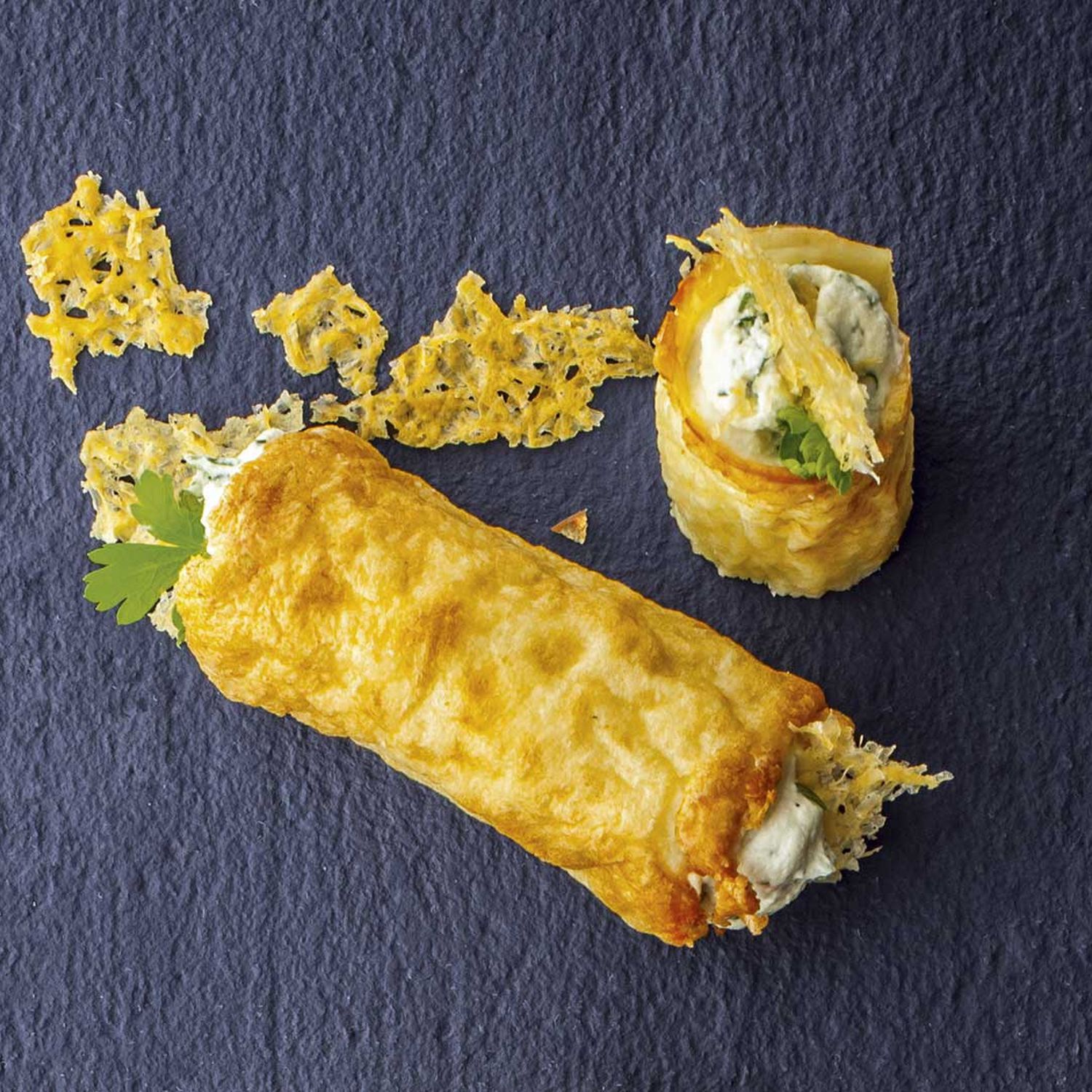 Im Ofen für ca. 15 Minuten backen. Noch warm in Rechtecke schneiden und auf die leicht eingefetteten Schaumrollenförmchen rollen. Danach auf das Backpapier geben und noch einmal kurz backen (bis der Käse schön goldbraun ist).