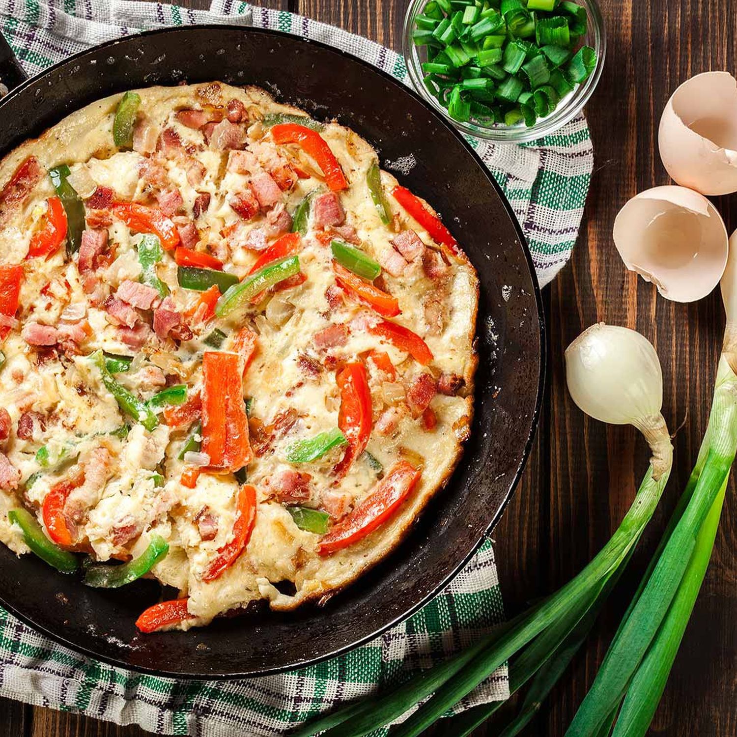 Butter in einer Pfanne schmelzen und Speck-, Jungzwiebel- und Paprikawürfel kurz anschwitzen.