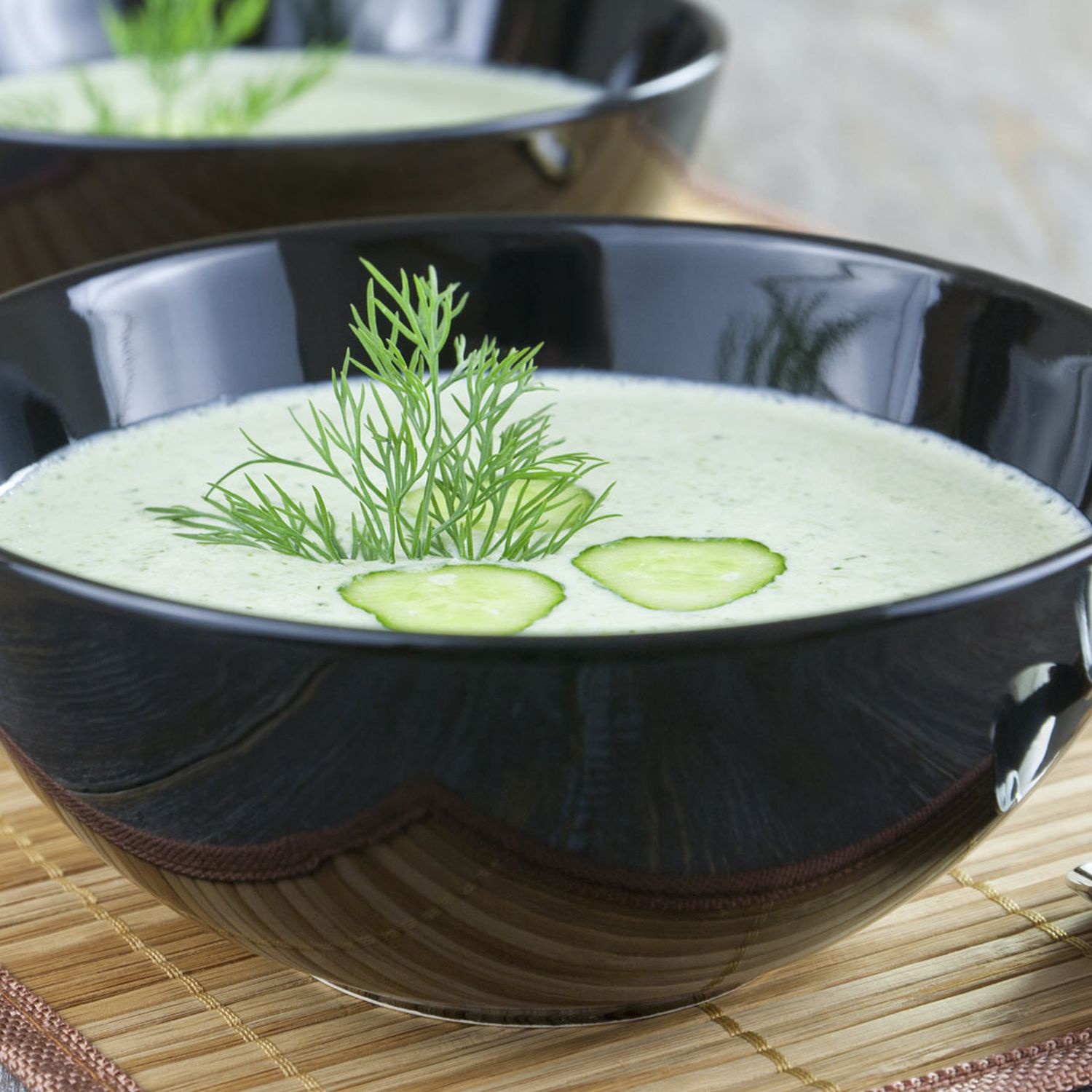 Das zur Seite gelegte Gurkenstück in feine Scheiben schneiden. Suppe aus dem Kühlschrank nehmen, nochmals mit dem Mixer aufschäumen und in Suppenschüsseln füllen. Mit knusprigen Vollkornbrot-Croûtons, Gurkenscheiben und Dill dekorieren.