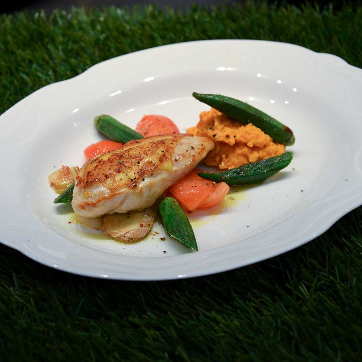 Hendlbrust mit Süßkartoffelpüree und Okraschoten