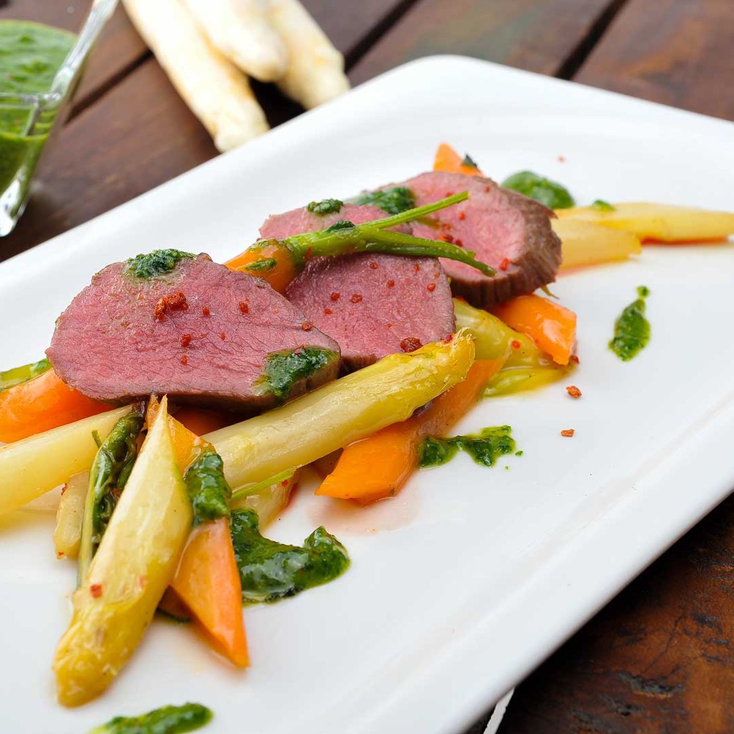 Das Gemüse auf warmen Tellern verteilen. Den Lammrücken in Scheiben schneiden und auf dem Gemüse anrichten. Das Pesto außen herum träufeln.