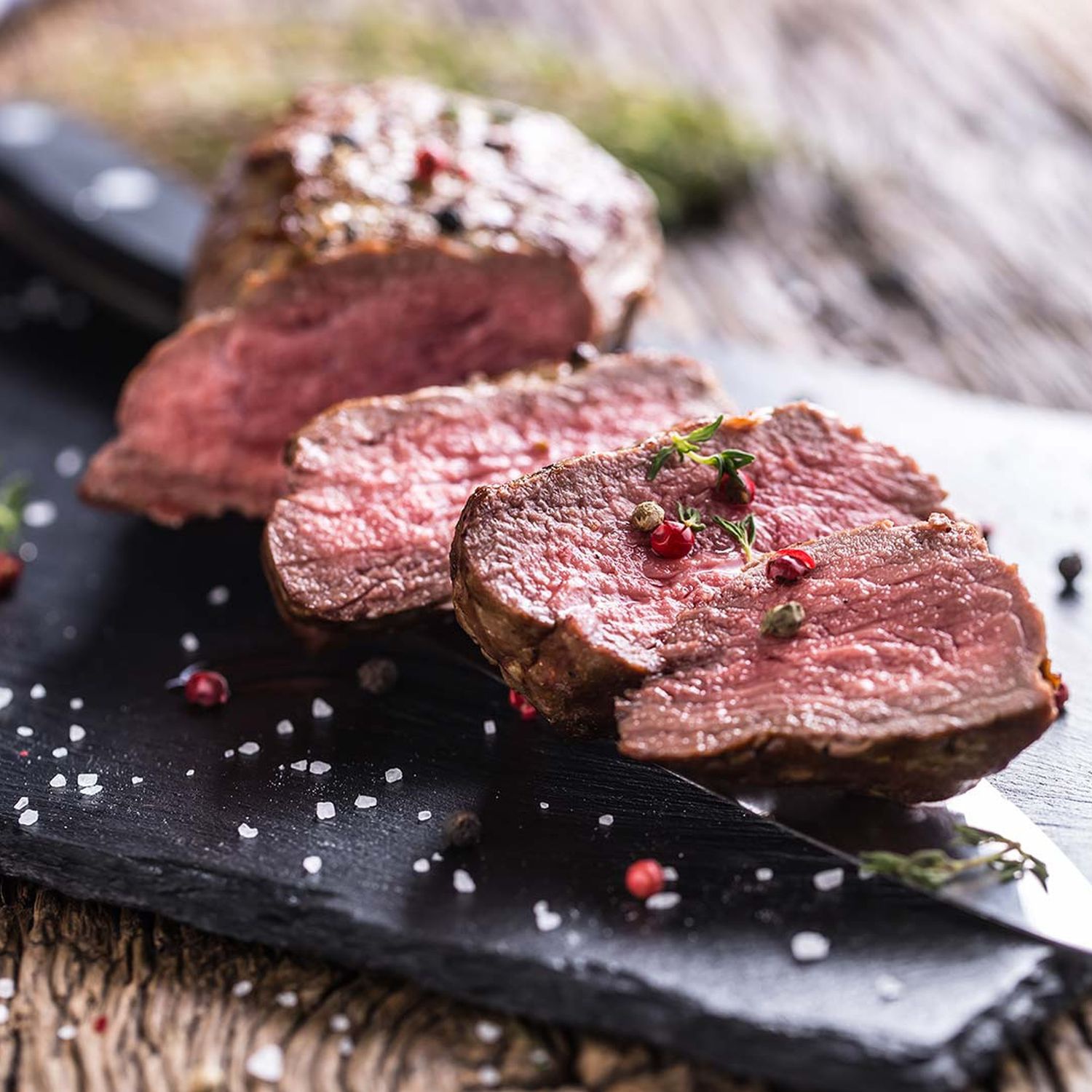 Das Fleisch in der Pfanne 2 ½–3 Minuten anbraten, bis an der Oberfläche Fleischsaftperlen austreten. Die Steaks wenden und weitere 2 ½–3 Minuten braten, bis erneut Fleischsaftperlen austreten. Die Steaks vom Herd nehmen und in der Pfanne noch 1–2 Minuten ziehen lassen. Das Olivenöl und das Steak- und Grillgewürz in die Pfanne geben und die Steaks darin wenden. Mit Chili Salz etwas nachwürzen.