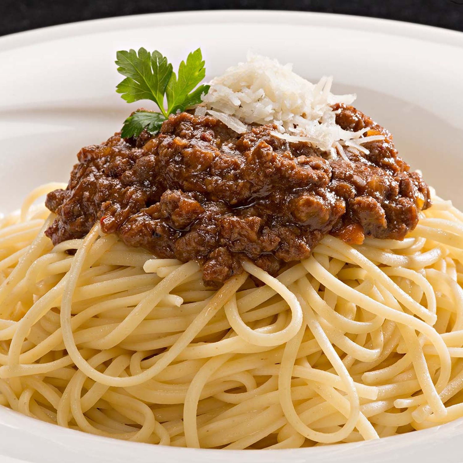 Die Spaghetti in vorgewärmten Pastatellern anrichten und die Sauce Bolognese darauf verteilen. Mit Parmesan bestreut servieren und genießen.