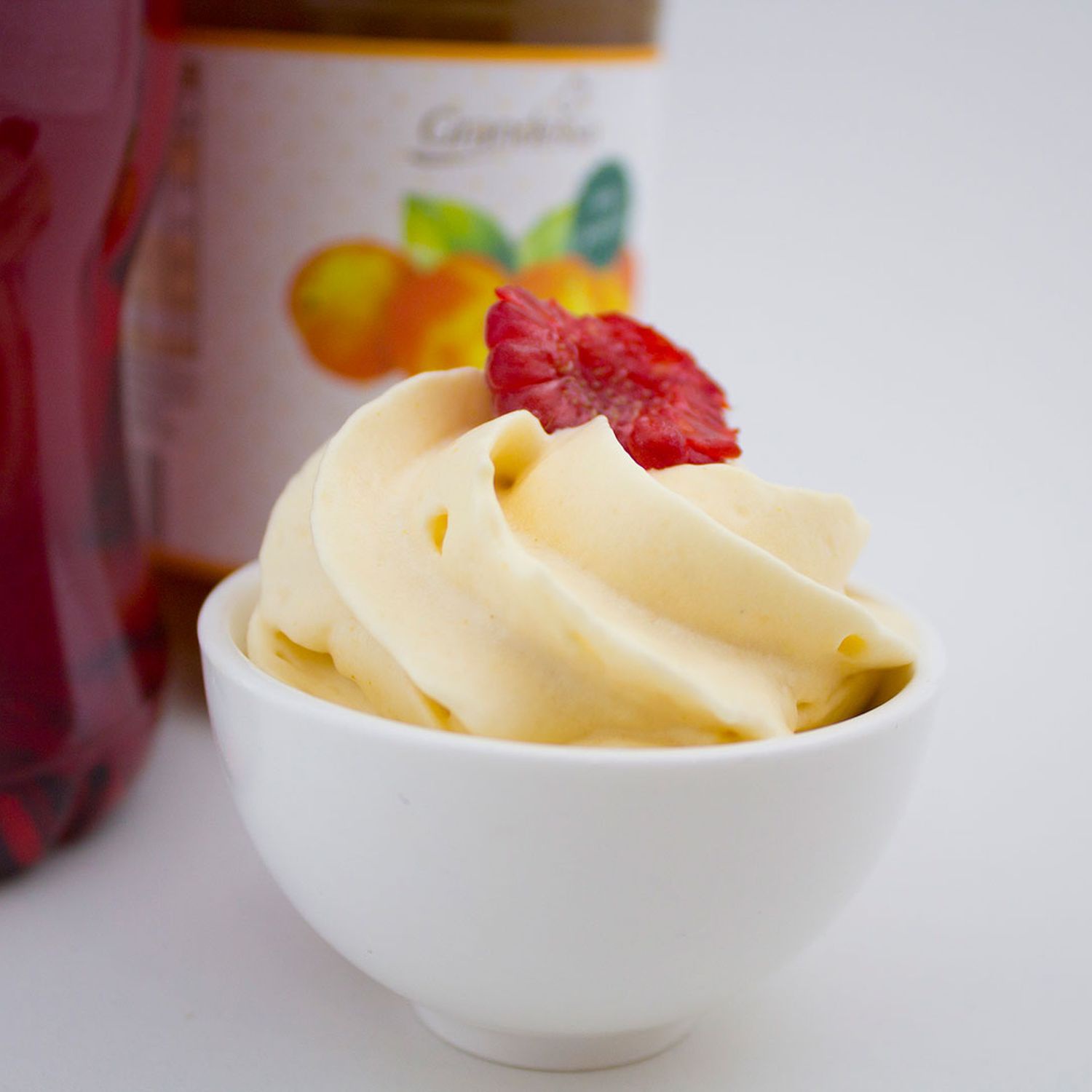 In ein Glas füllen und optional mit einer frischen Himbeere garnieren.