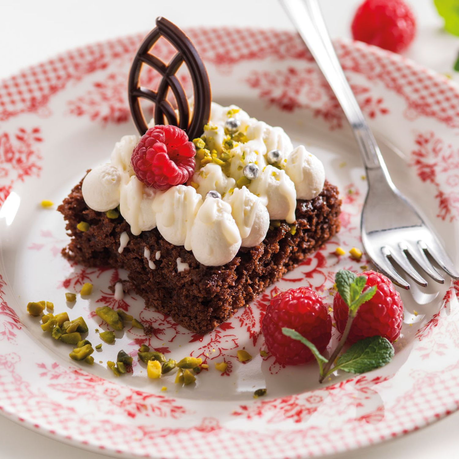Aus dem Teig 1 Stück pro Portion ausstechen. Jeweils mit Kaffeelikör beträufeln und die Pistazien darauf verteilen. Nun das Kaffee-Obers auf die Pistazien dressieren. Mit der weißen Glasur beträufeln. Mit Dekor und etwas Pistazien dekorieren.