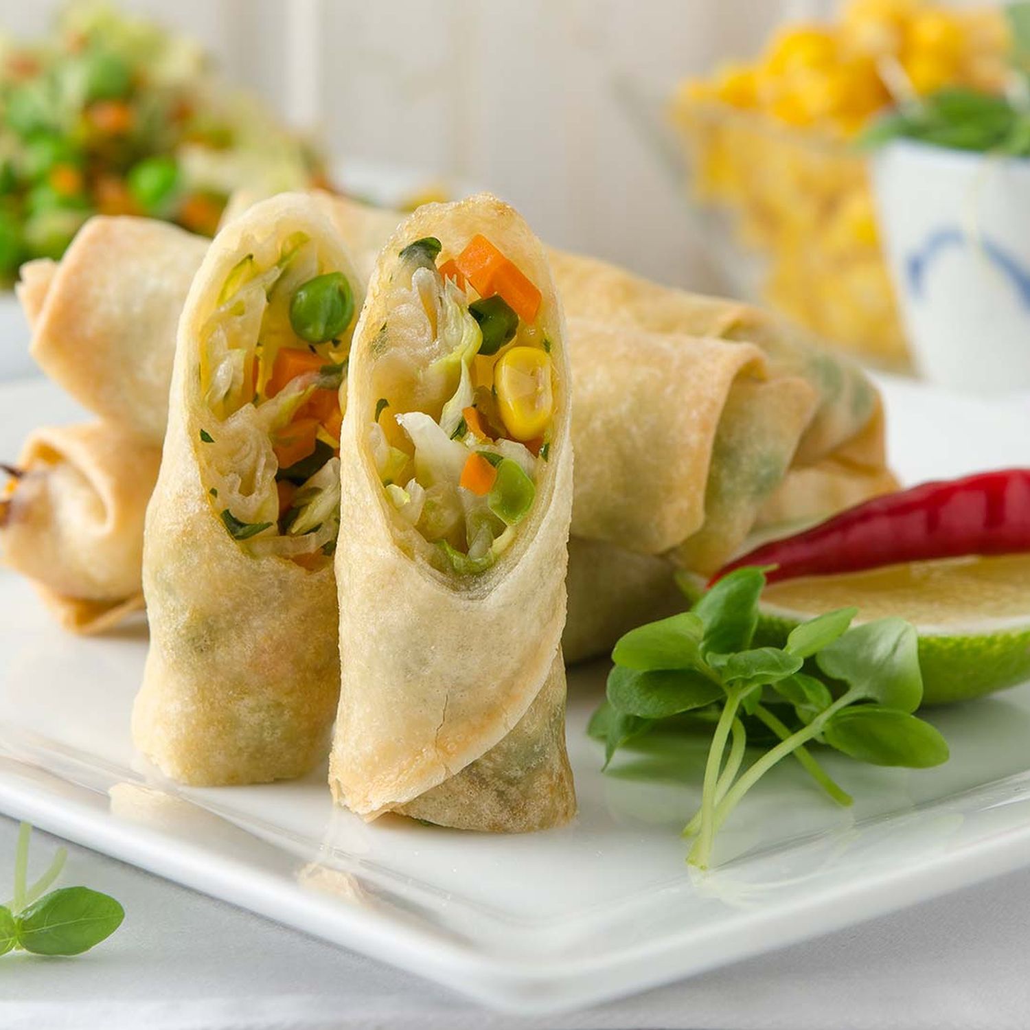 Für knusprige Frühlingsrollen zunächst die Karotten waschen und fein würfeln. Den Mais abtropfen lassen. Karotten und Erbsen in Salzwasser bissfest kochen. In der Zwischenzeit den Koriander waschen, trocknen und fein hacken. Den Eisbergsalat waschen, trocken schleudern und in dünne Streifen schneiden. Die Chilischote entkernen und fein hacken.
