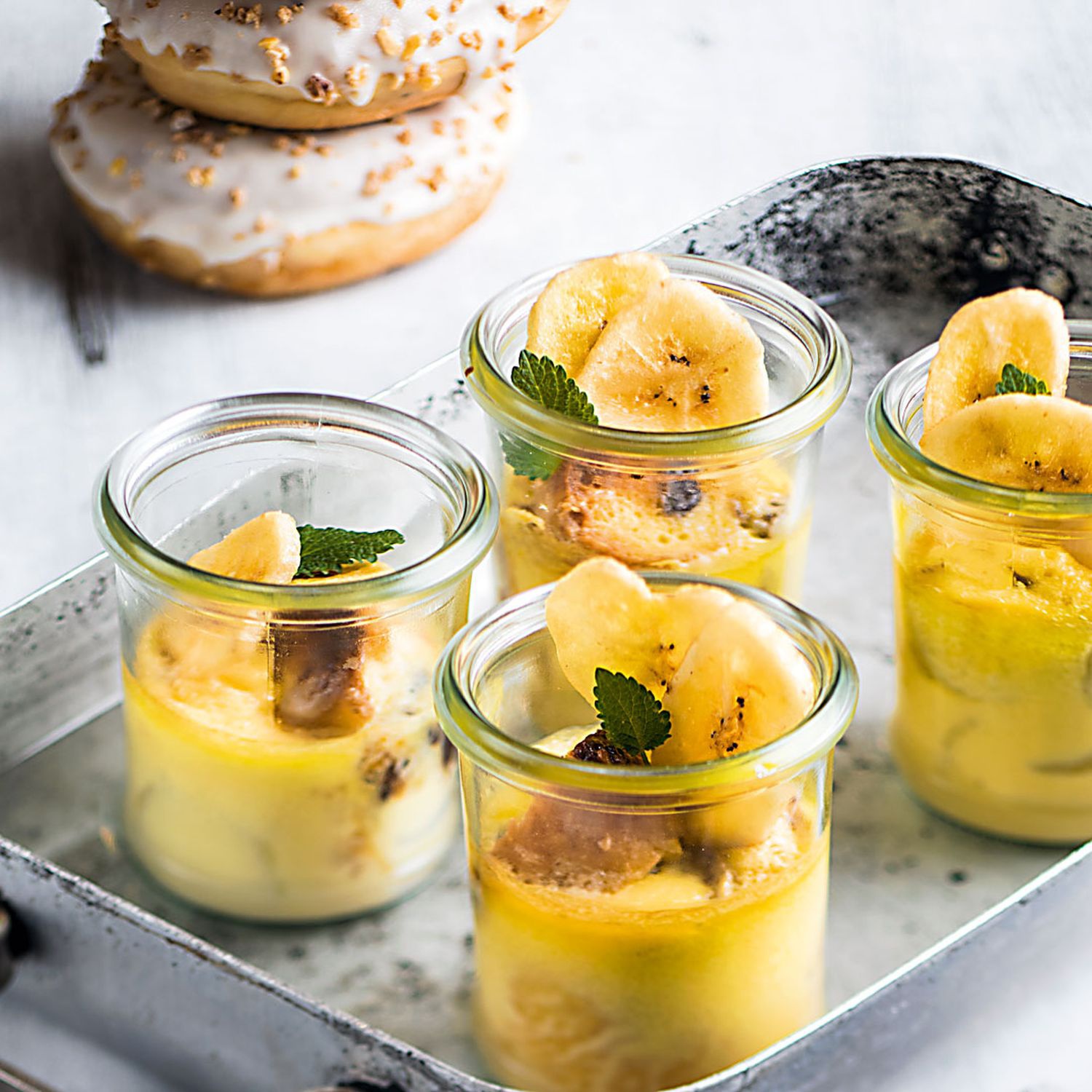 Die Donuts in ca. 2 cm große Würfel schneiden. Mit den Bananen vermischen und in 4 Gläser füllen.