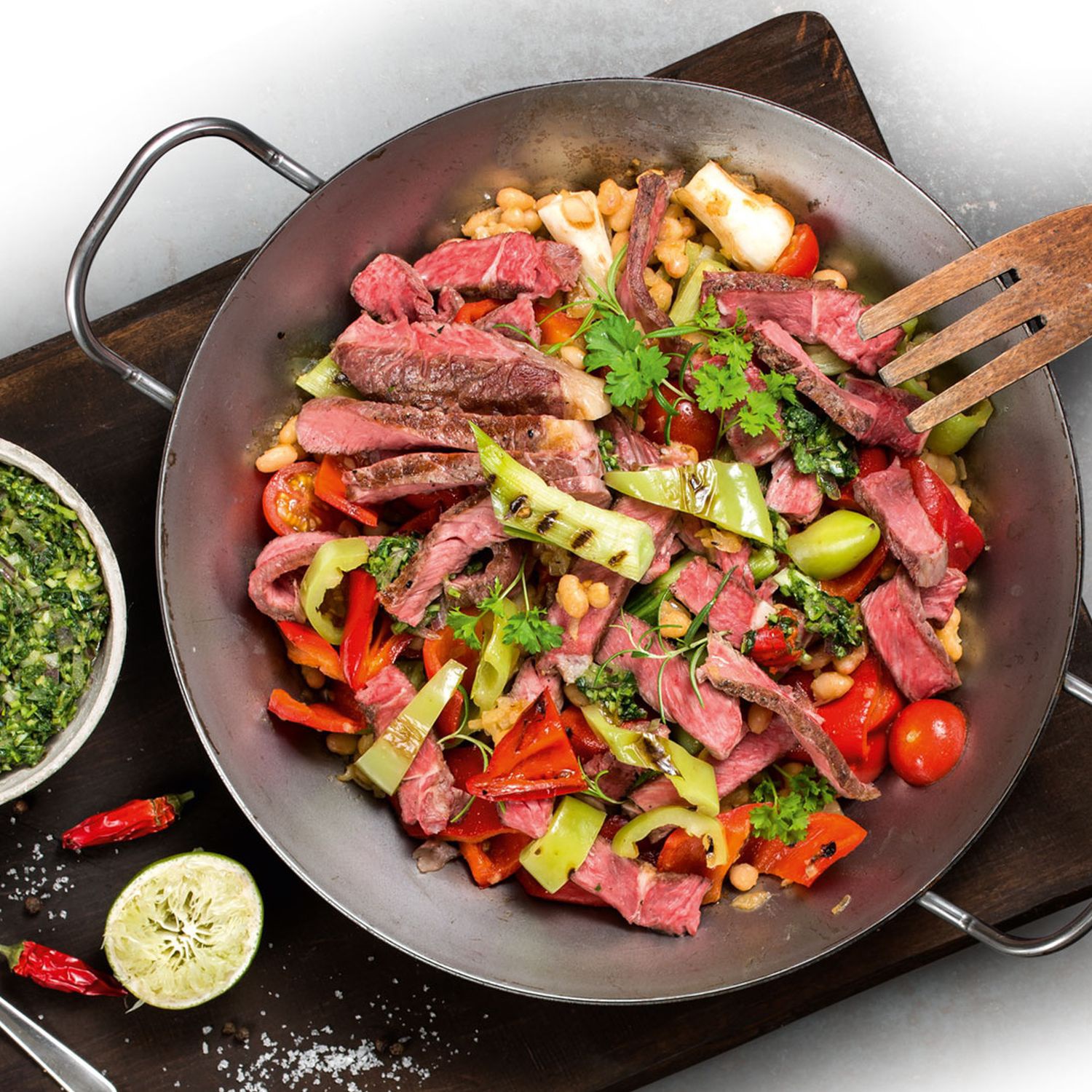 Die Steakstreifen zum Gemüse in der Pfanne geben, kurz schwenken und mit der Kräuter-Chimichurri servieren.