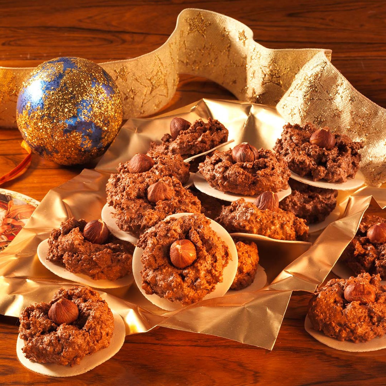 Mit einem Löffel kleine Häufchen auf die Oblaten setzen. Mit einer ganzen Haselnuss verzieren.
