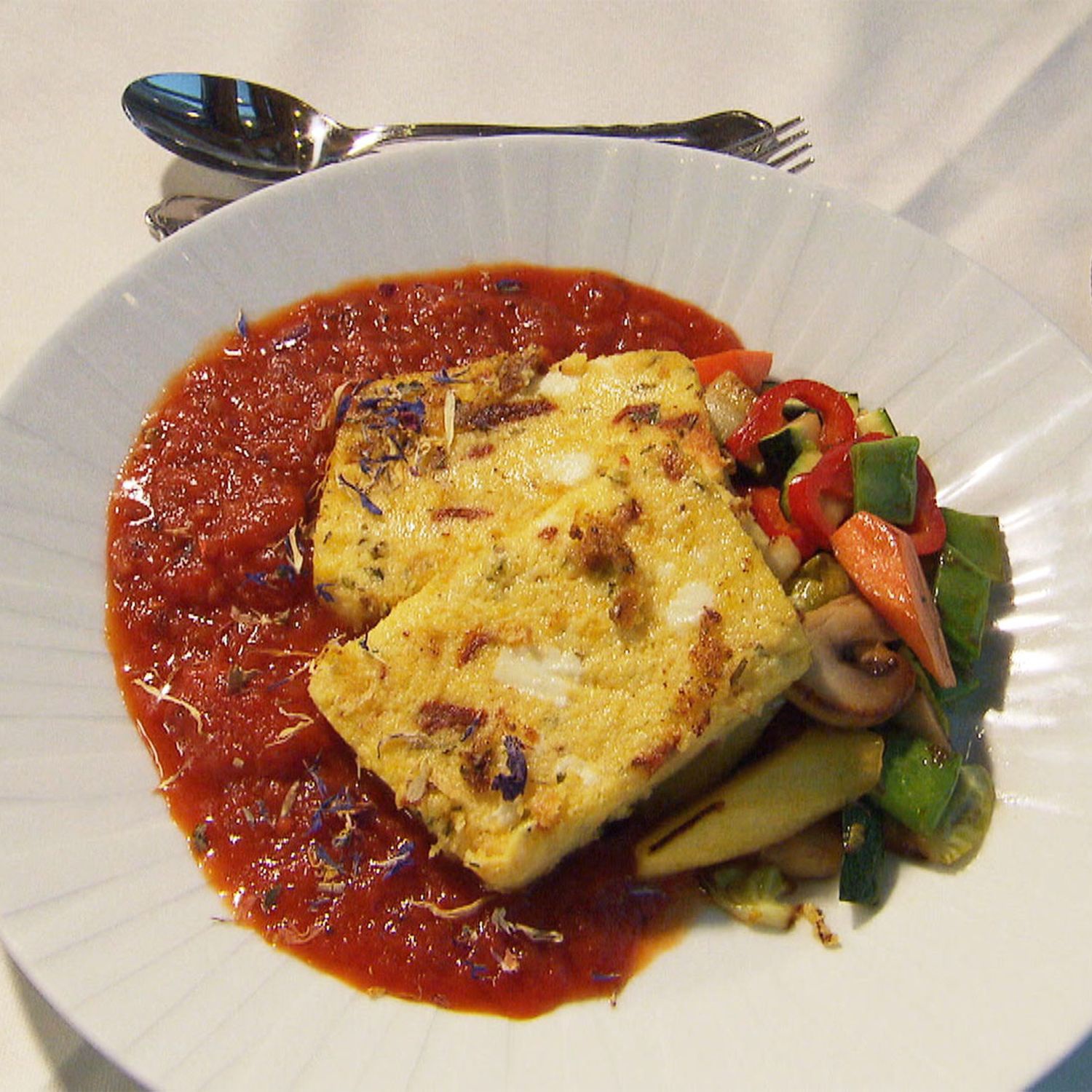 Danach die Terrine abkühlen lassen und stürzen. In ca. 1 cm dicke Scheiben schneiden und in etwas Olivenöl knusprig anbraten. Mit der Tomatensoße und frischem Gemüse anrichten und genießen.