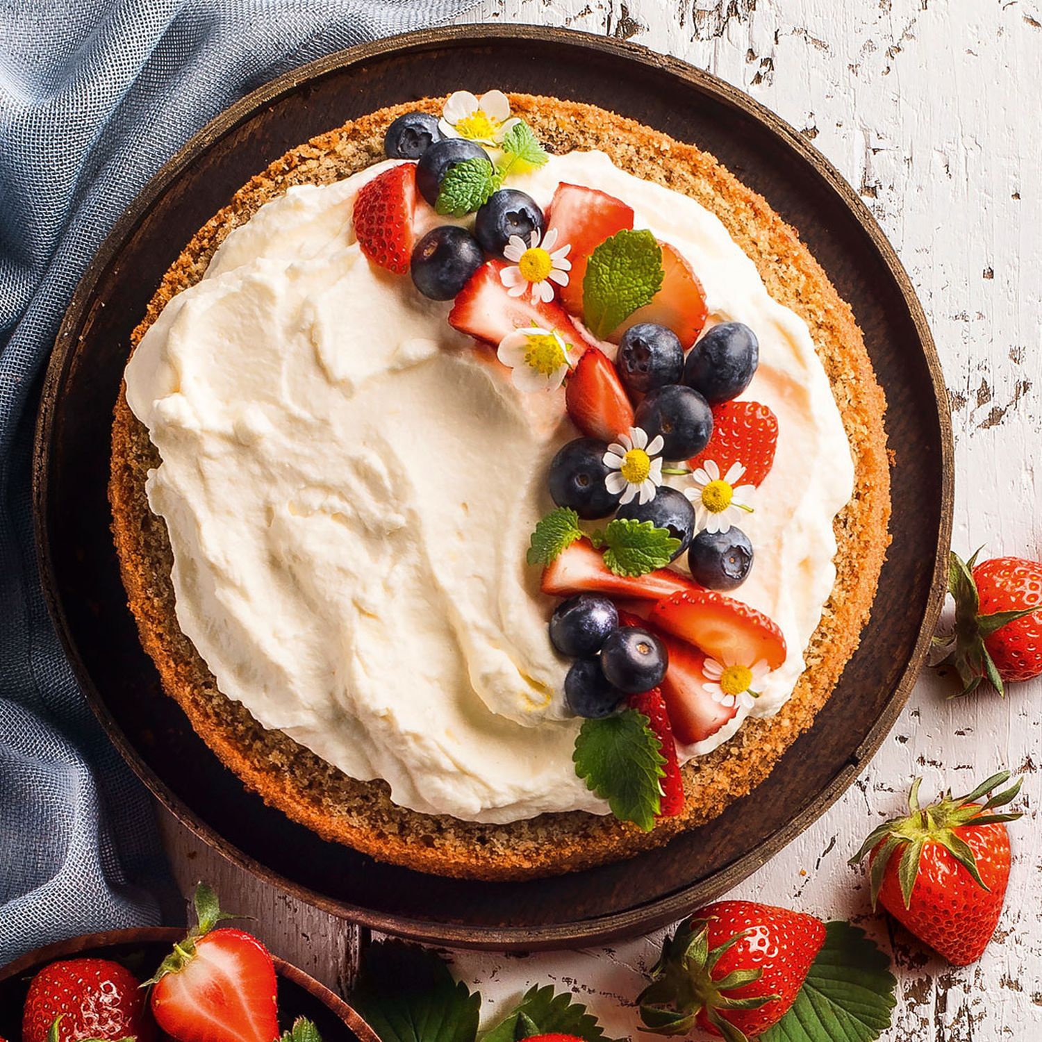 Der Haselnusskuchen mit Beeren und Obers passt nicht nur optisch in den Sommer. Der fruchtig-frische Genuss eignet sich perfekt für eine Kafferunde mit Familie und Freunden.