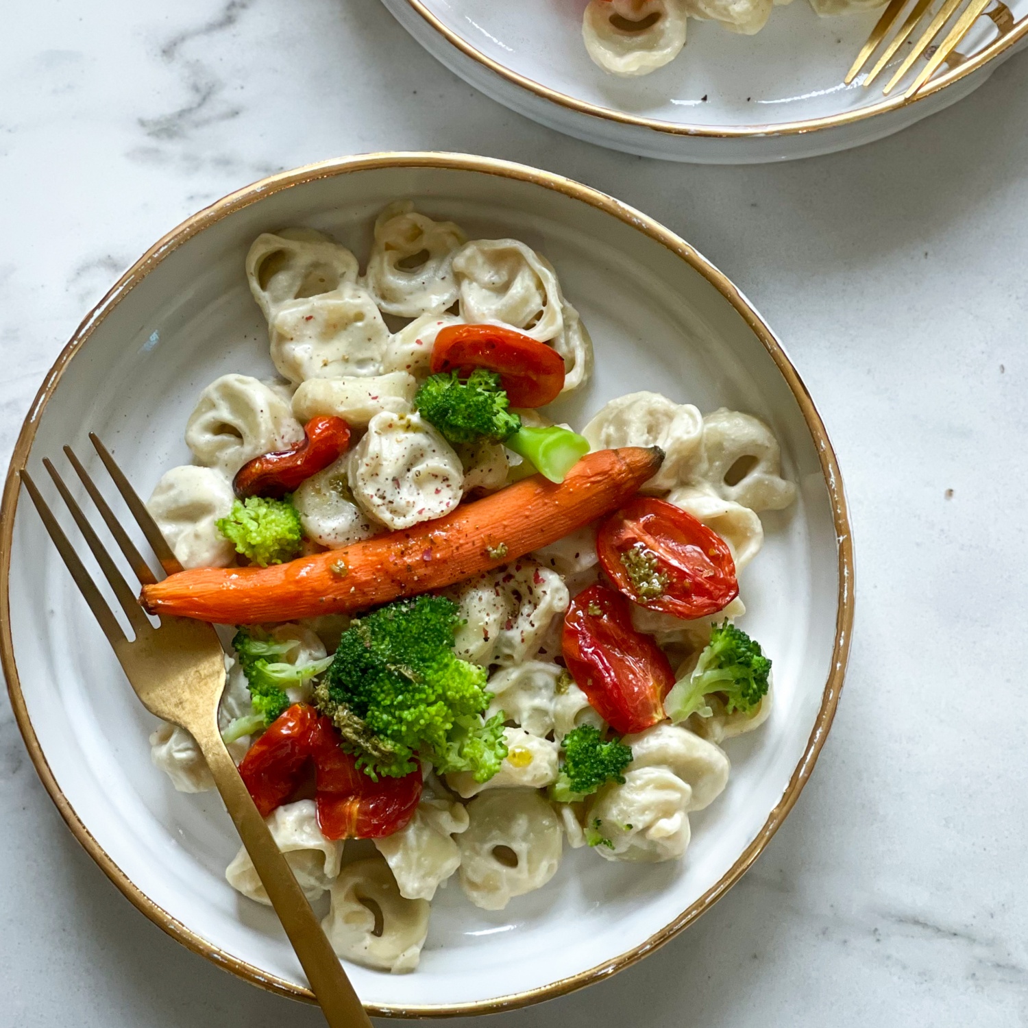 Ein köstliches und buntes Pasta-Gericht, dass sich sehen lässt! Zubereitet mit Tortellini, Ofengemüse und selbstgemachter Alfredo Sauce sind diese Alfredo Tortellini ein wahrer Genuss.