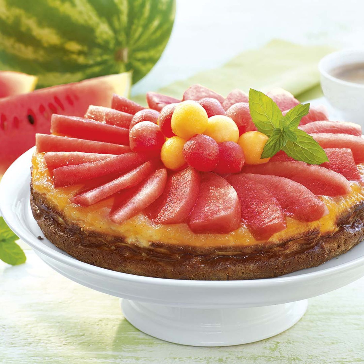Den Kuchen auf eine Kuchenplatte setzen und das Topping darüber geben. Mit Melonenstücken und Minzblättern dekorieren.