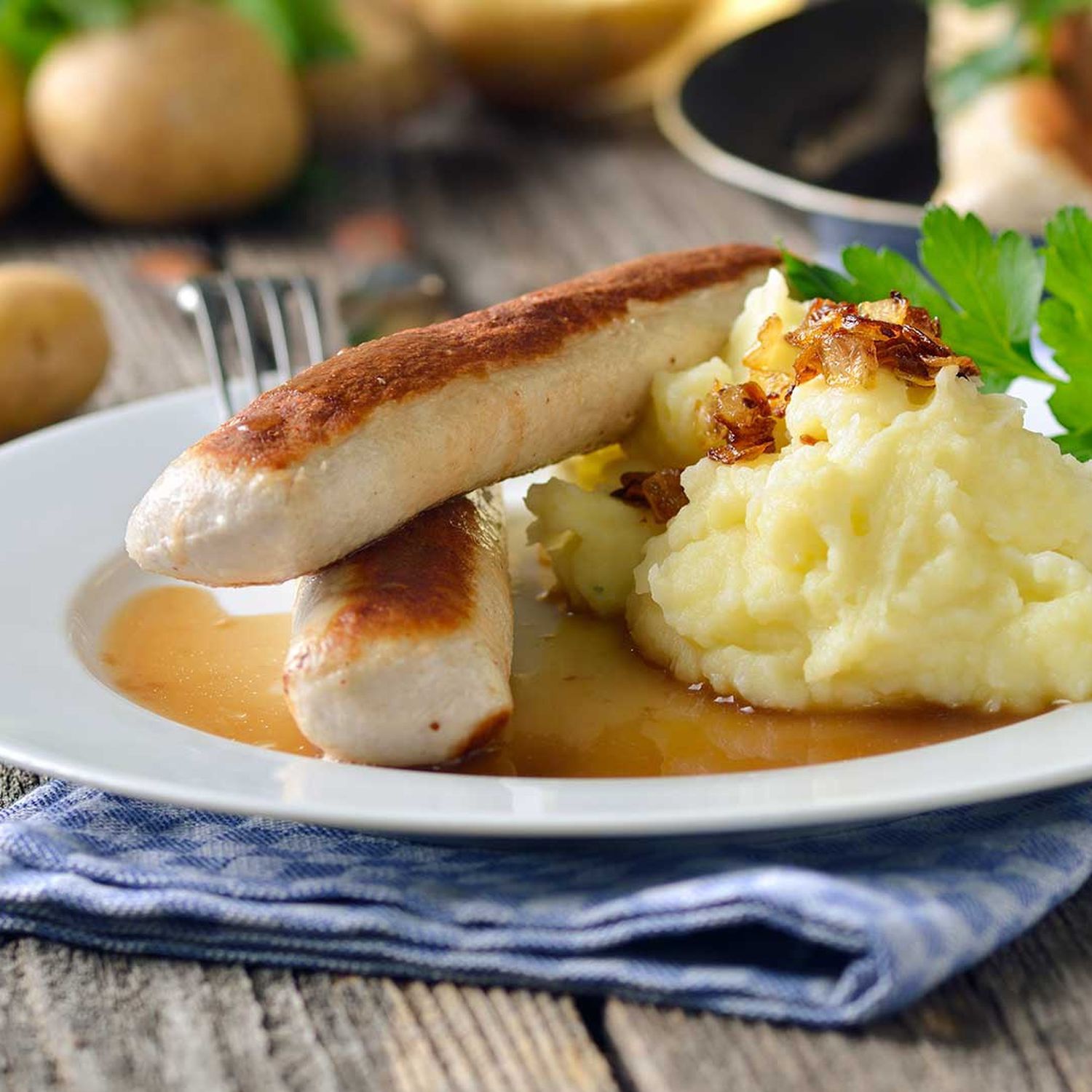 Die Bratwürste mit dem Püree anrichten und die Zwiebelringe darüber geben.